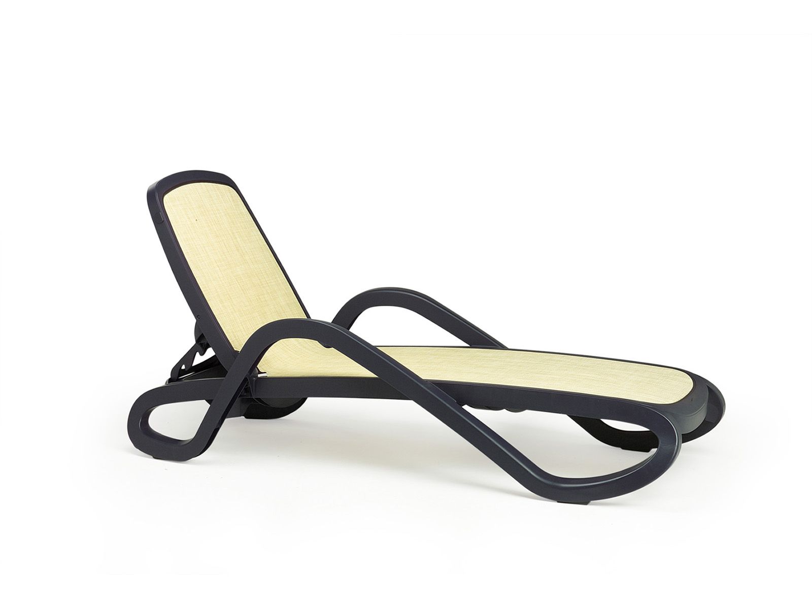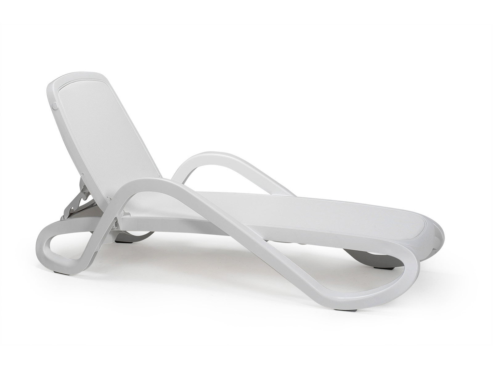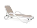 Karfás, kerekes, UV álló műanyagvázas napozóágy, 4 fokozatban állítható háttámlával, cserélhető, légáteresztő szintetikus szövet fekvőfelülettel. Háttámlára szerelhető napellenző elérhető hozzá (Parasole napellenző). Kültérre is ajánlott, rakásolható.