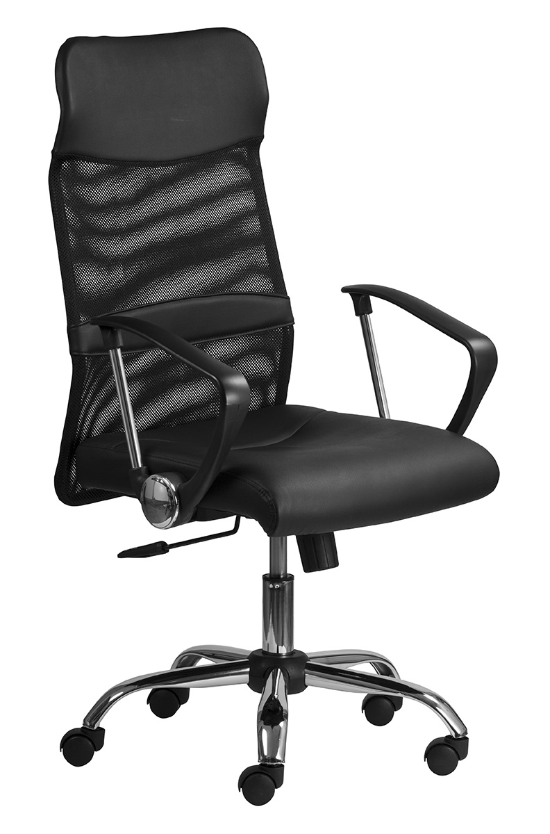 Magas, hálós háttámla műbőr betéttela fejtámlán és a deréktámaszon, műbőr kárpitozású ülőlap, fix műanyag karfa, állítható rugózási keménységű hintamechanika, krómozott gázlift, krómozott lábkereszt, teherbírás: 110 kg