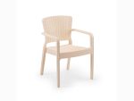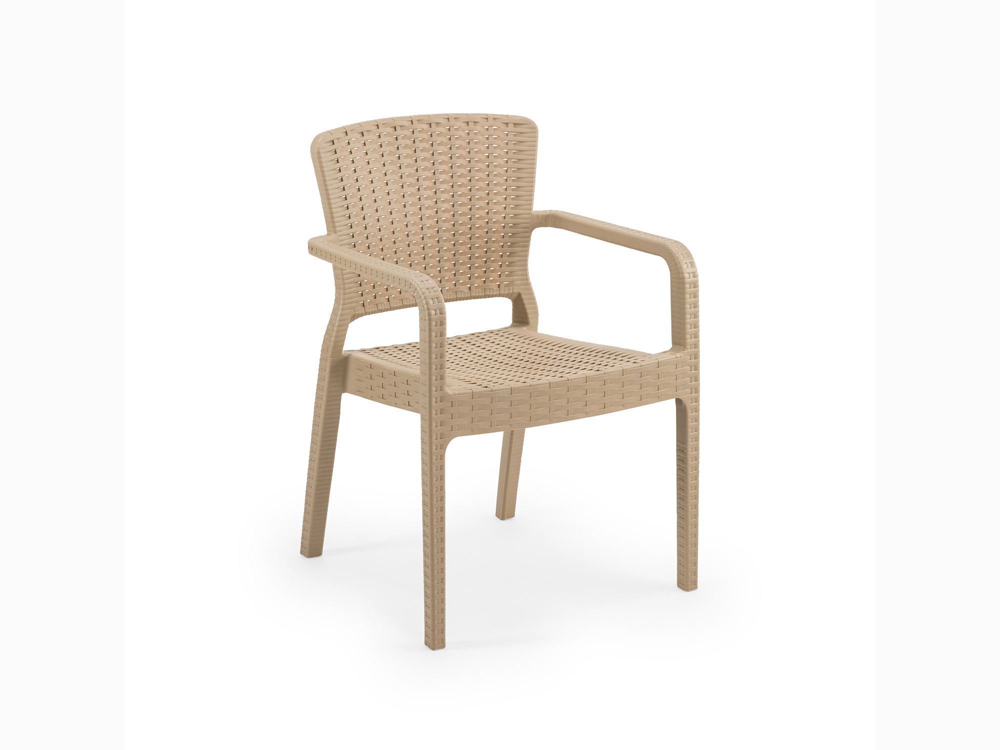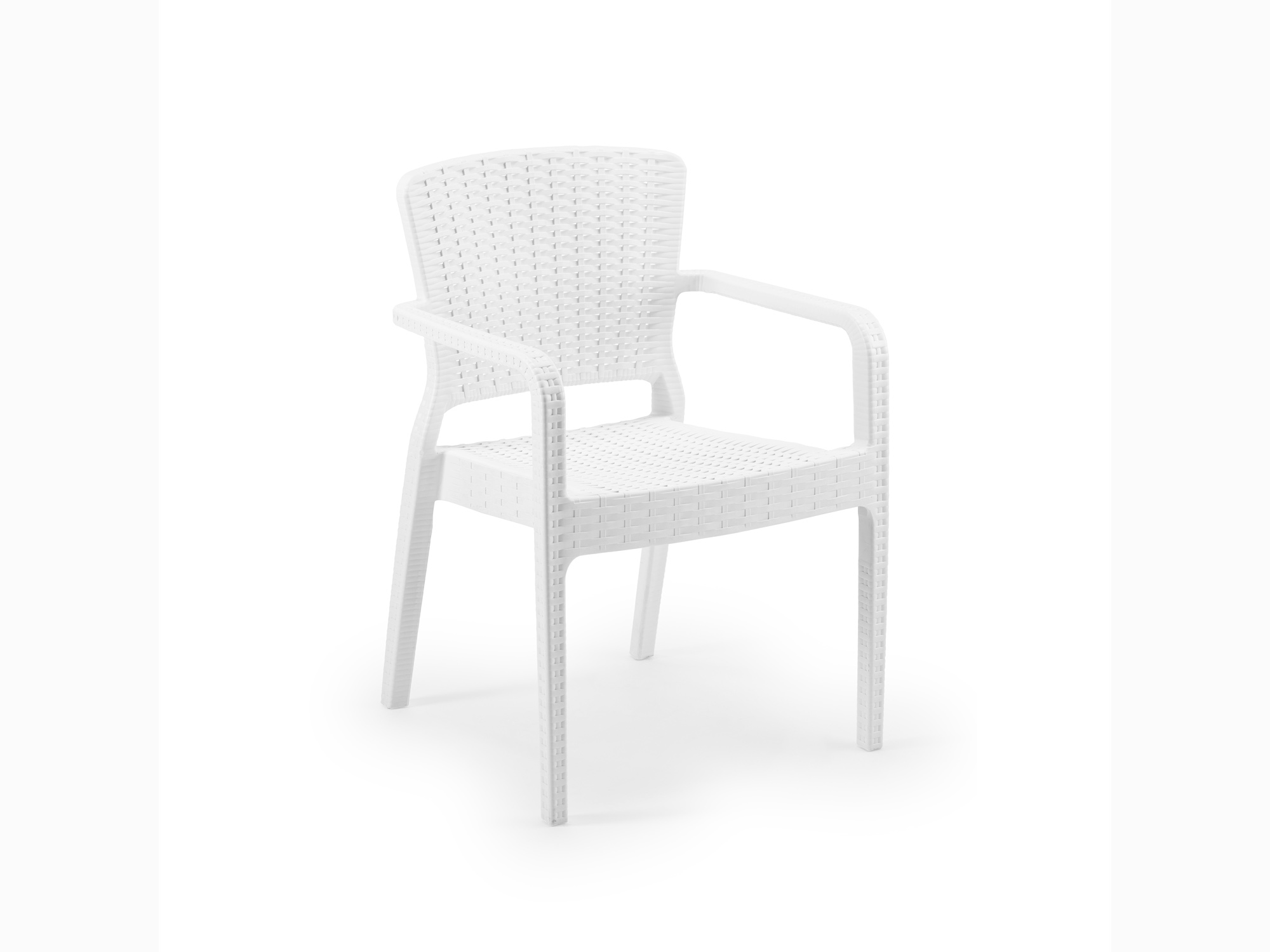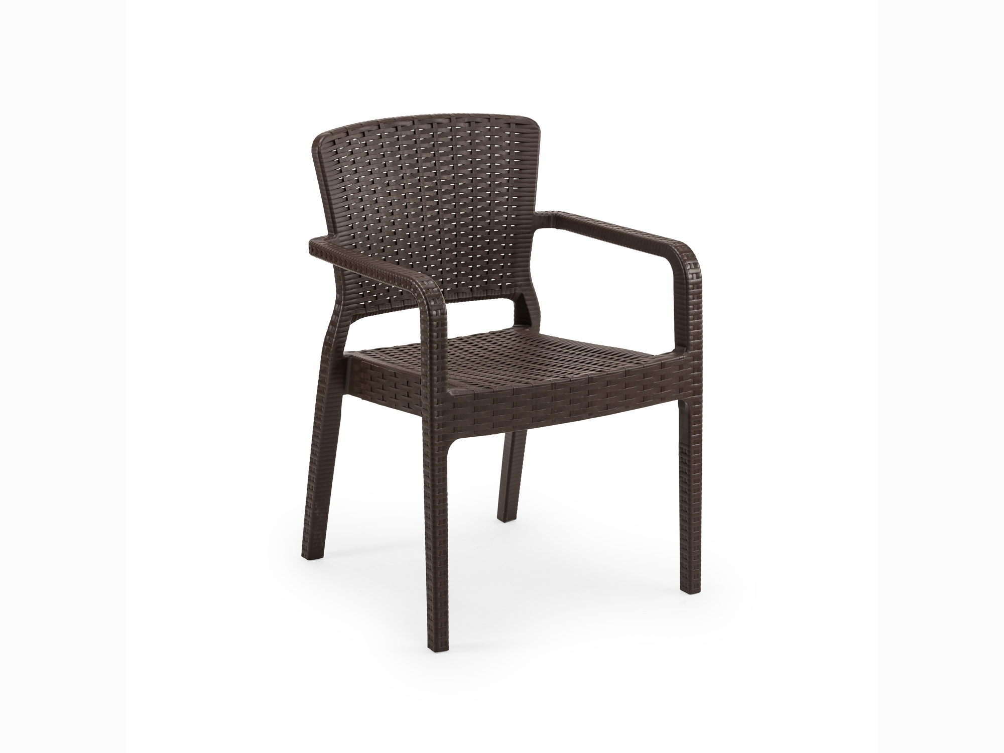 Polyrattan hatású, karfás, egybeöntött műanyag szék. Rakásolható. Kültérre is ajánlott. Ülőpárna elérhető hozzá.