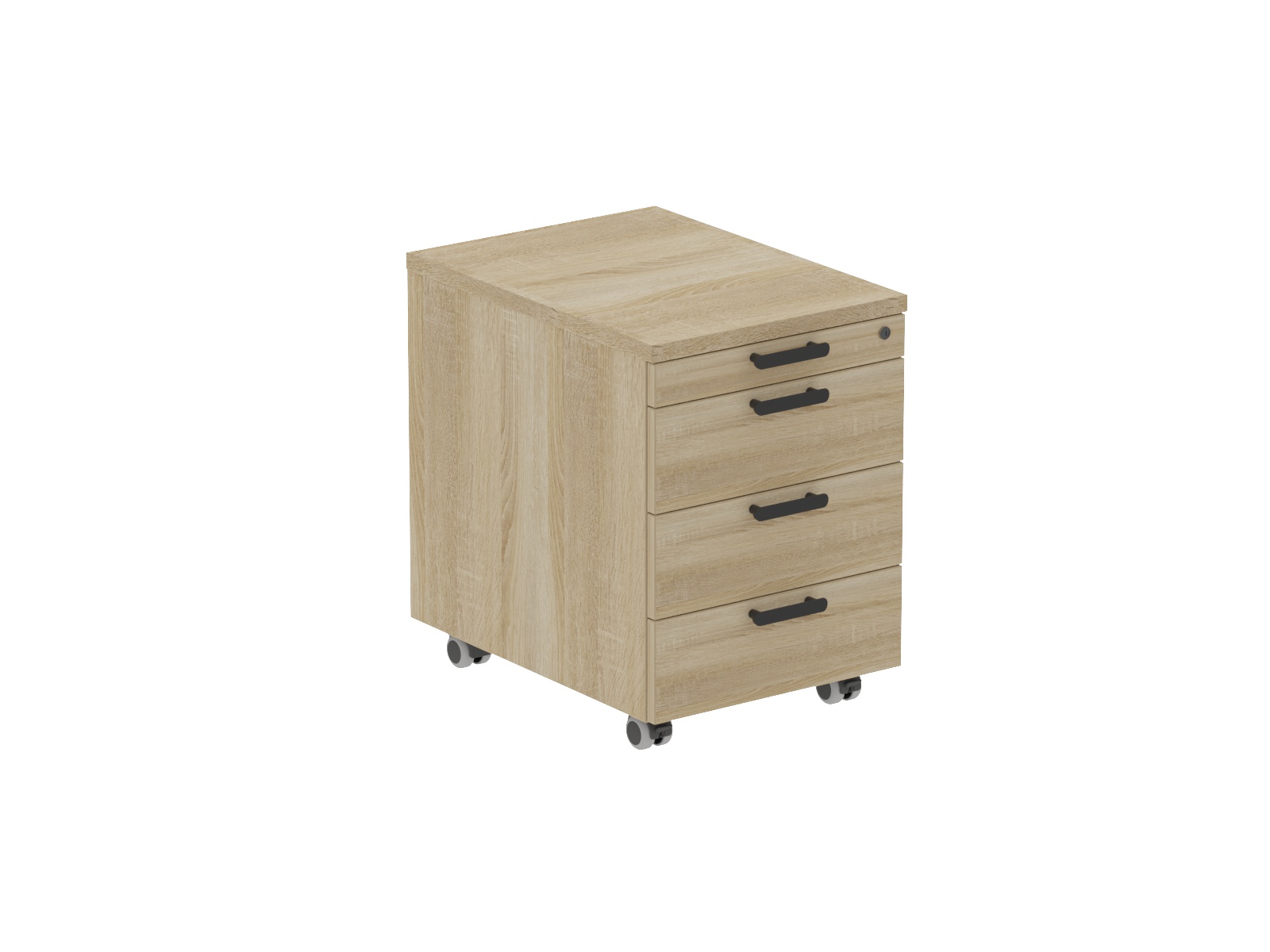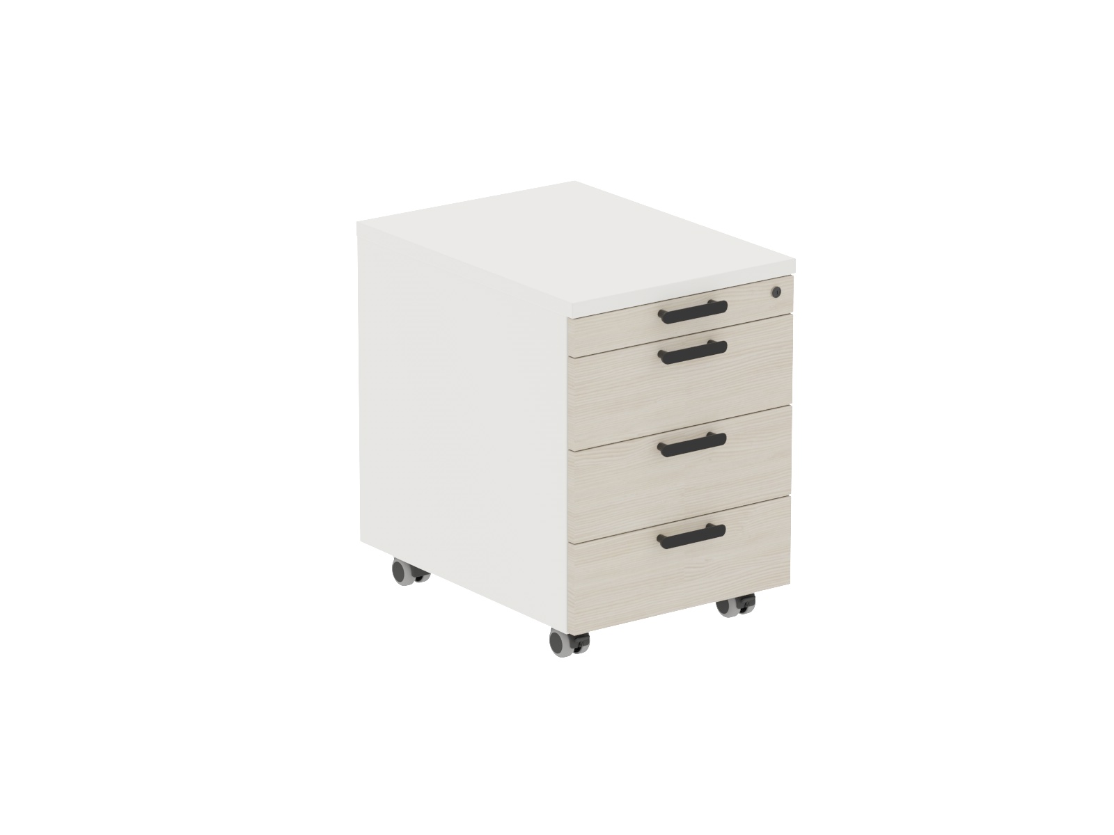 18 mm vastag laminált faforgácslapból készül 2 mm-es ABS élzárással, fedlappal. 3 db fiókkal, felül 1 db íróeszköz tárolóval. Központi fiókzárral szerelt, 4 db görgővel a mozgathatóságért.