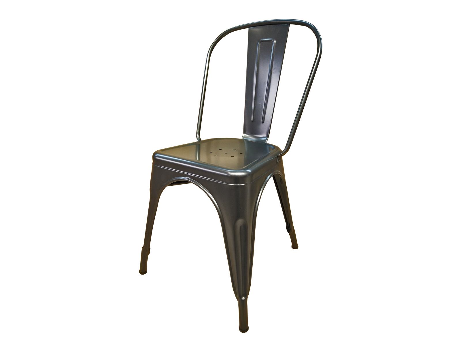 Ipari, vintage stílusú acélvázas szék, acél ülőfelülettel gun metal színben. Kültére is ajánlott, rakásolható.