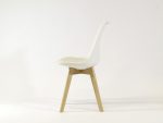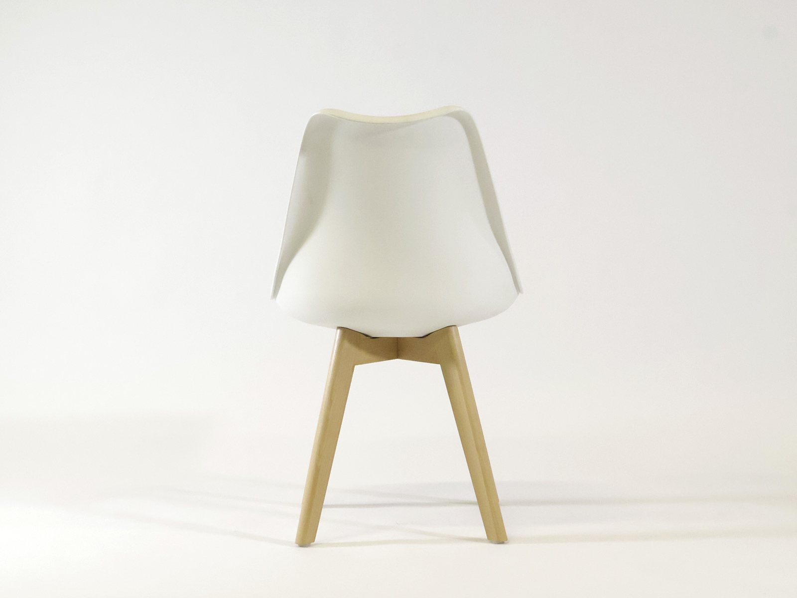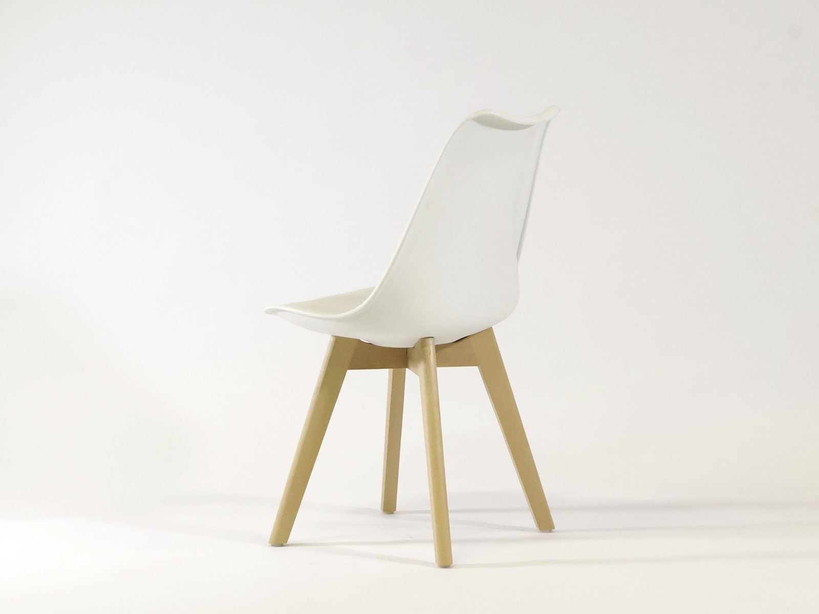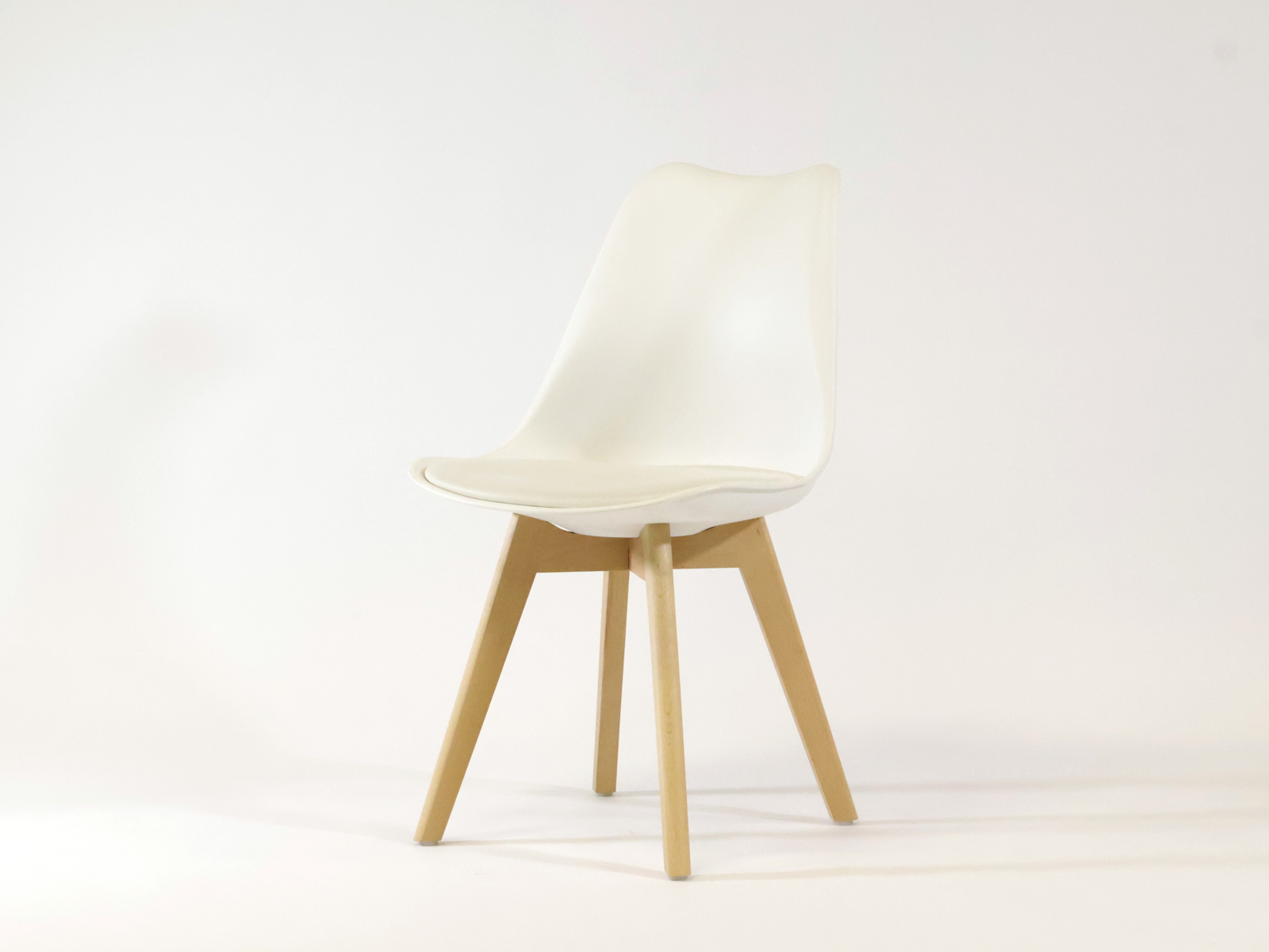 Falábú szék, fehér műanyag palásttal, fehér műbőrrel bevont ülőfelülettel. Beltérbe ajánlott.