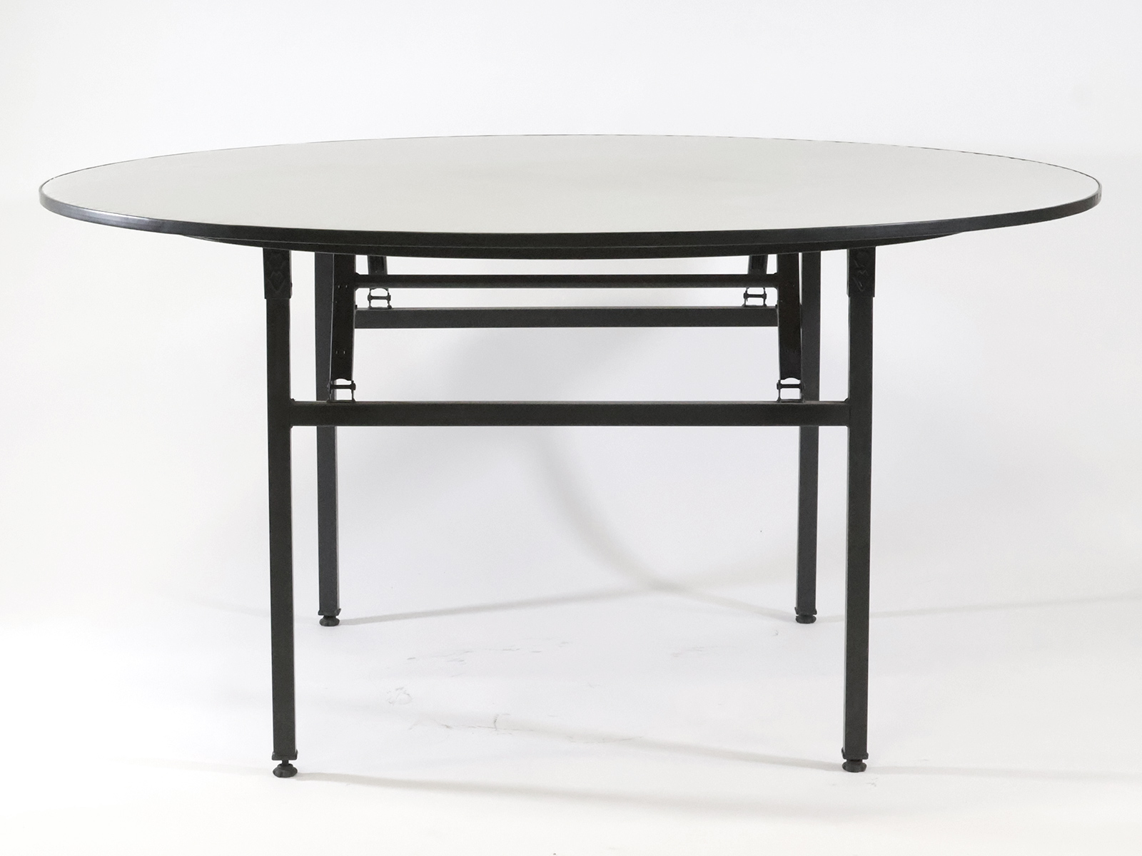 Összecsukható lábú bankett asztal, 150 cm átmérőjű, rétegeltlemez bázisú, vékony, puha, vízhatlan réteggel bevont asztallappal, PVC élzárással. Beltérbe ajánlott. Tárolásra is alkalmas asztalszállító kocsi elérhető hozzá.
