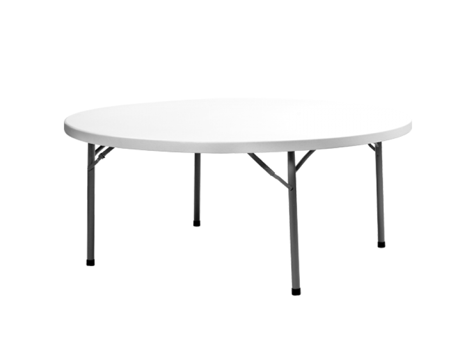 Összecsukható lábú acélvázas bankett asztal, 180 cm átmérőjű műanyag asztallappal. Kültérre is ajánlott. Tárolásra is alkalmas asztalszállító kocsi elérhető hozzá.