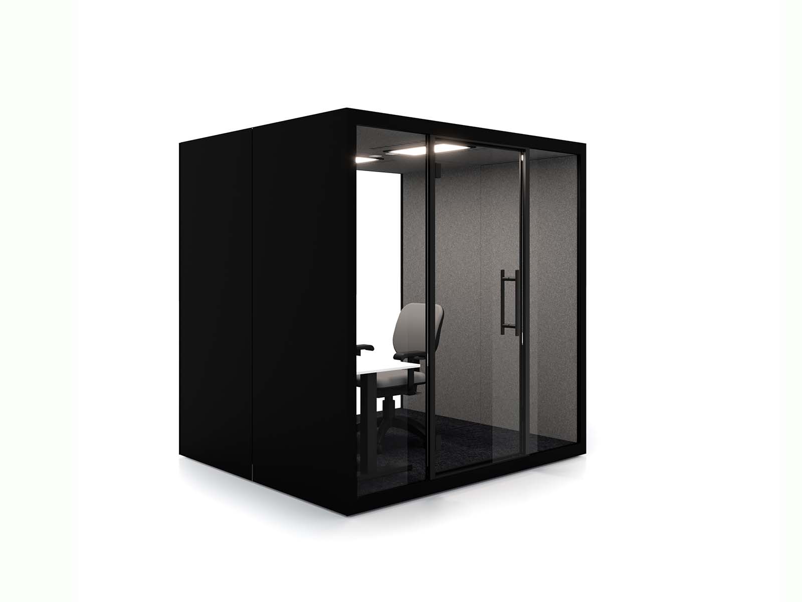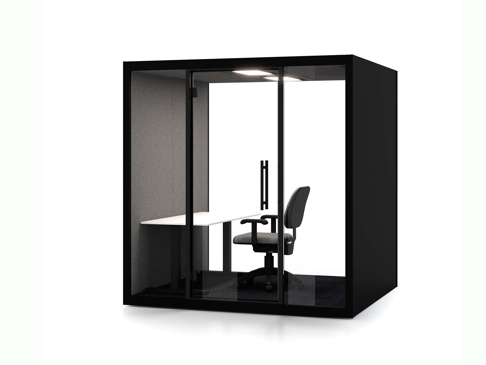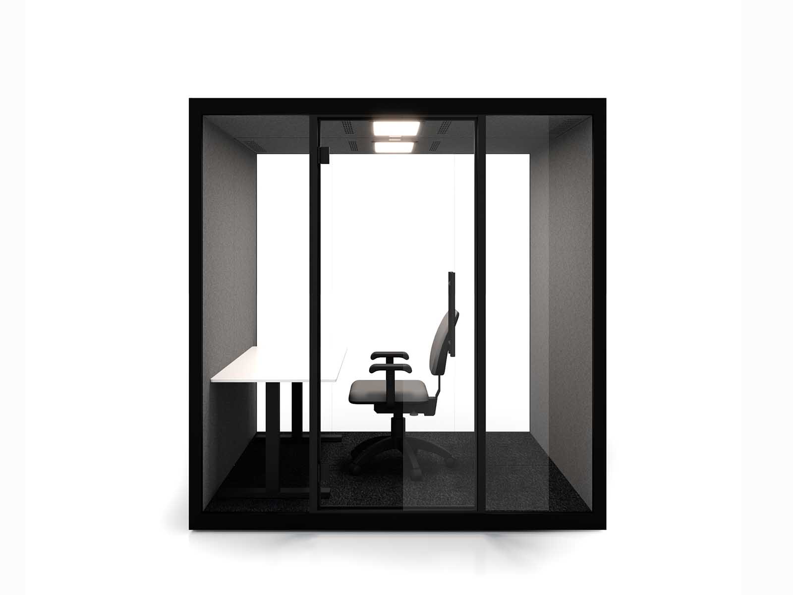 Egy csendes hely a kreativitás kibontakoztatásához. Növelje hatékonyságát a különleges hangszigetelésnek köszönhetően. A nagy forgalmú és zajos környezetben ideális megoldás telefonálásra, megbeszélésre, relaxációra. A korpusz felülete festett acéllemez, RAL 9011 fekete és RAL 9003 fehér színekben választható. (felár ellenében rendelkezésre állnak további színek.) Az ajtó választható nyitásirányú, biztonsági üvegből készül. A belső tér sötétszürke színű. Tápcsatlakozó: fali, 110-240 V (10 A) +2x USB-A töltő. A mindig friss levegőt az integrált légkeringető rendszer biztosítja. A megfelelő fényről érzékelős LED lámpa gondoskodik. Szintezhető állító talpakkal a padló egyenetlenségeinek kiküszöbölésére. A fülke belső mérete: 200x204x186 cm. További kiegészítők külön rendelhetők. A telepítésről kérje írásos árajánlatunkat.