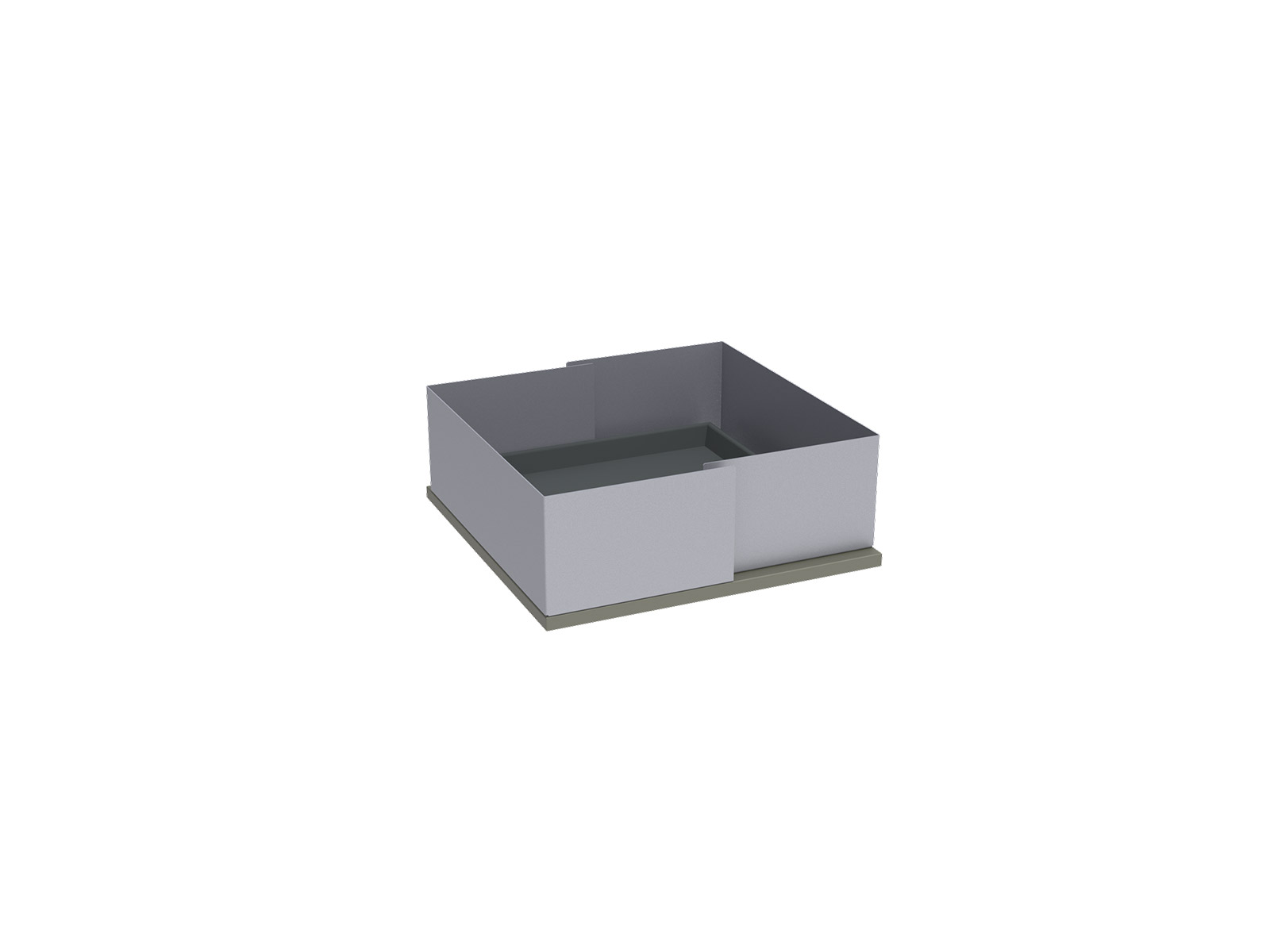 Elektrosztatikus porszórással felületkezelt 1,5 mm vastag hajlított acéllemezből készül. Antracit színű műanyag virágalátéttel szállítjuk. Rögzítése csavarozással történik a Cube Locker egységek tetejére elhelyezett fedőlapra.