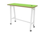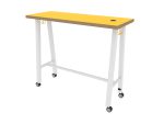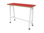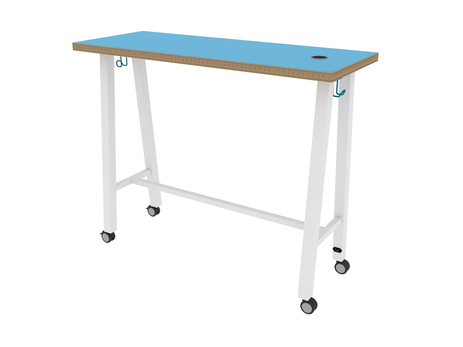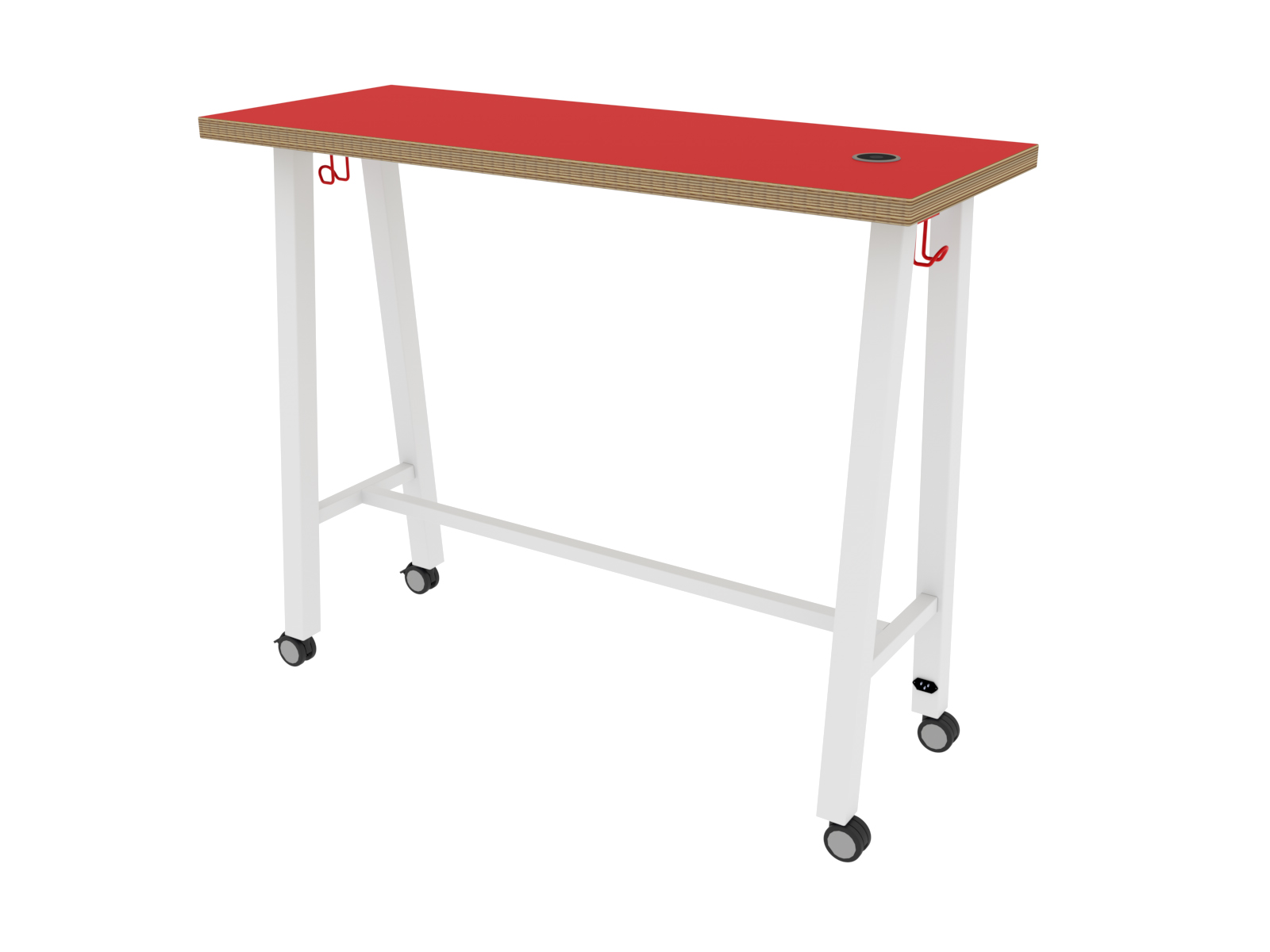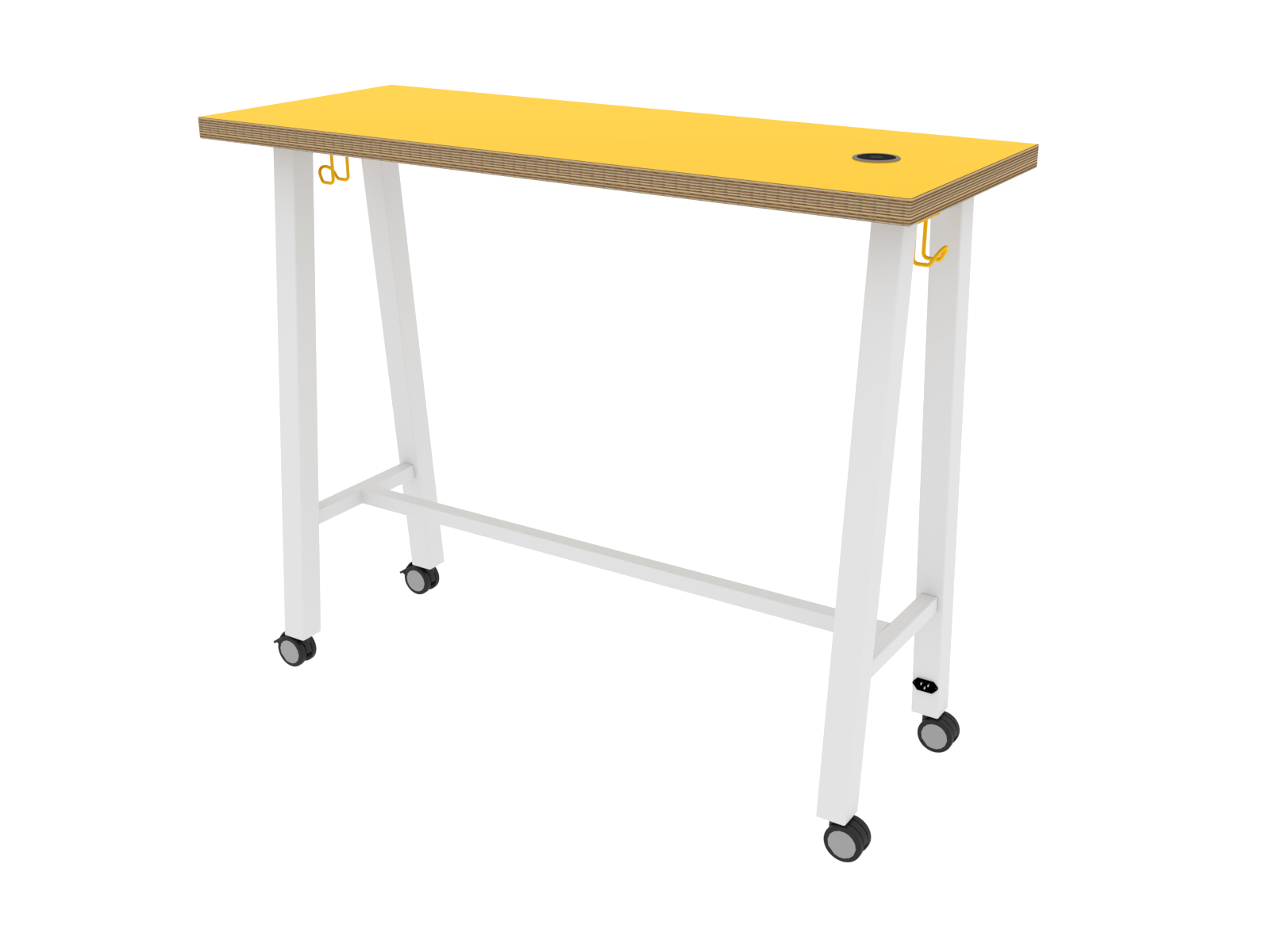 Vázszerkezet: 50x50x2 mm-es zártszelvény lábak, 30x30x1,5 mm-es zártszelvény taposóval, fém talppal, az asztallap alatt 60x20x1,5 mm-es zártszelvény vázzal, szinterezett felülettel, önbeálló görgőkkel (2 db sima, 2 db fékezhető). Az asztallap 15 mm vastag rétegelt lemez duplungolt (30 mm-es) kerettel. Az asztallap dekoritozott kivitel, élek marva, lenolajjal felületkezelve. Opcionálisan rendelhető vezeték nélküli USB töltő (az adapter az asztallap alá kerül rögzítésre). Két oldalon táskaakasztóval.