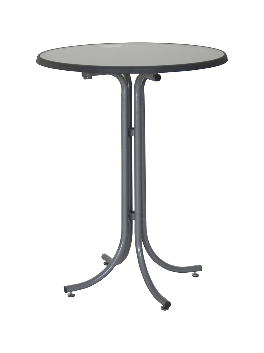 Összecsukható acélvázas bárasztal, 85 cm átmérőjű Sevelit asztallappal. Magassága 112 cm. A váz alapáron antracit színű, de felár ellenében krómozva is rendelhető.
