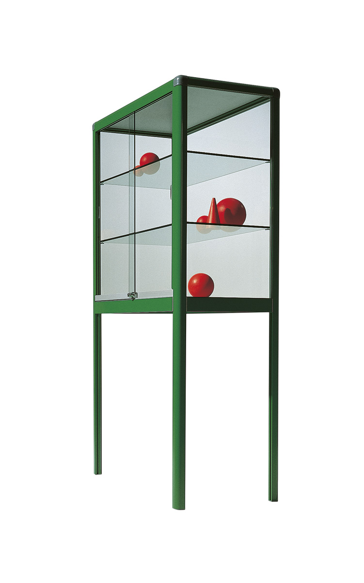 Elektrosztatikus porszórással festett alumínium lábszerkezet, ablaküveg oldalfalakkal, biztonsági cilinderzárral ellátott tolóajtókkal és üvegpolcokkal.