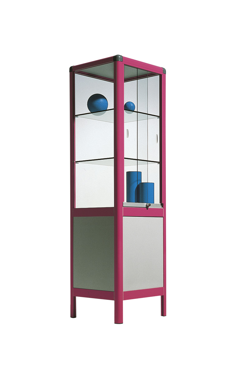 Elektrosztatikus porszórással festett alumínium lábszerkezet, ablaküveg oldalfalakkal, biztonsági cilinderzárral ellátott tolóajtókkal és üvegpolcokkal.
