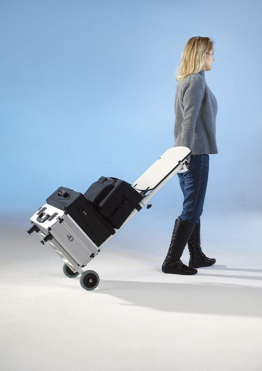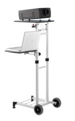Elektrosztatikus porszórással festett vázszerkezet, gördíthető, fokozatmentesen emelhető magasságú Resopal alsó és felső asztallappal.