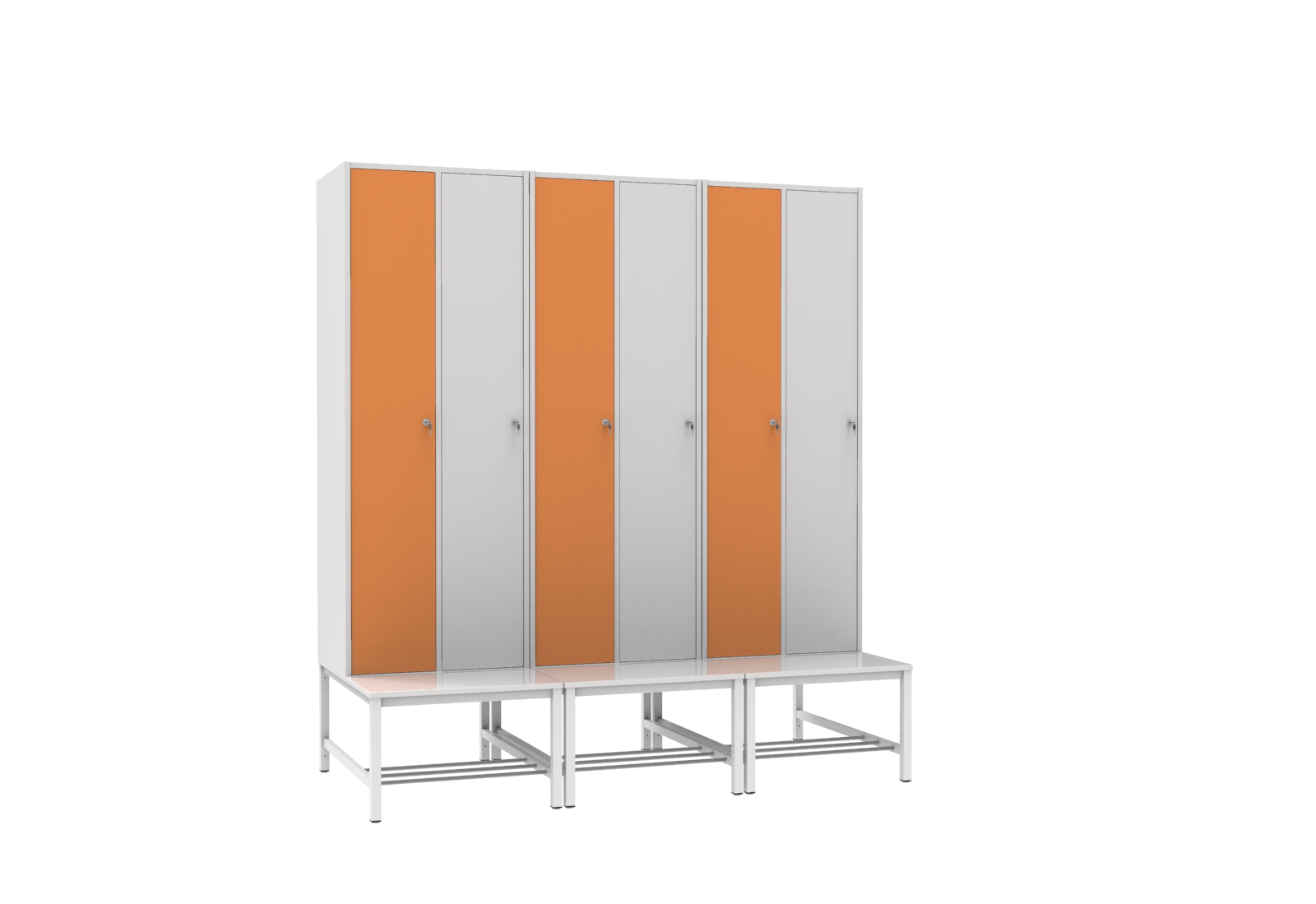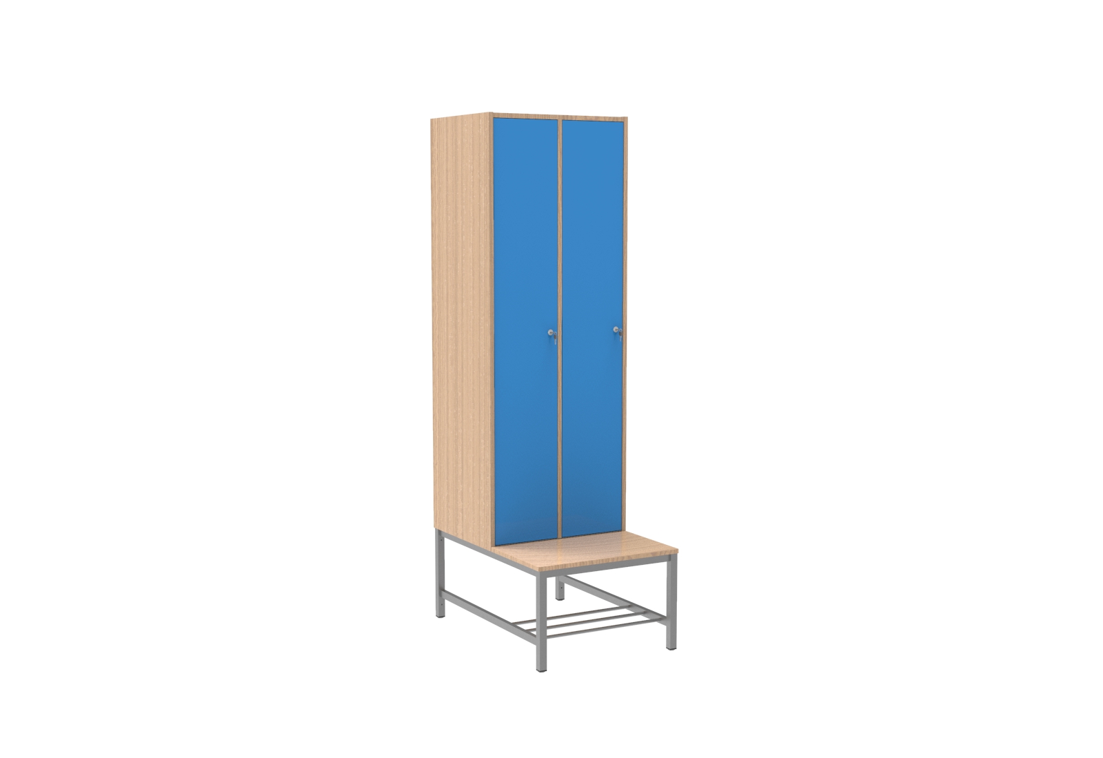 A korpusz, az ülőfelület és az ajtók 18 mm-es laminált bútorlapból készülnek ABS élzárással. A hátfal HDF lemezből van. A lábak elektrosztatikus porszórással felületkezelt 30×30 mm-es zártszelvényből készünek, a cipőtartó rács 13 mm-es acélcső pálcákból áll. A lábak végén szintezhető dugó van. Alapfelszereltség: ruhaakasztó rúd, ruhakampóval, kétkulcsos biztonsági zár, hátoldali szellőztető, kalaptartó polc. Az új kialakításnak köszönhetően a szekrény teljes magassága rendelkezésre áll a pakoláshoz.