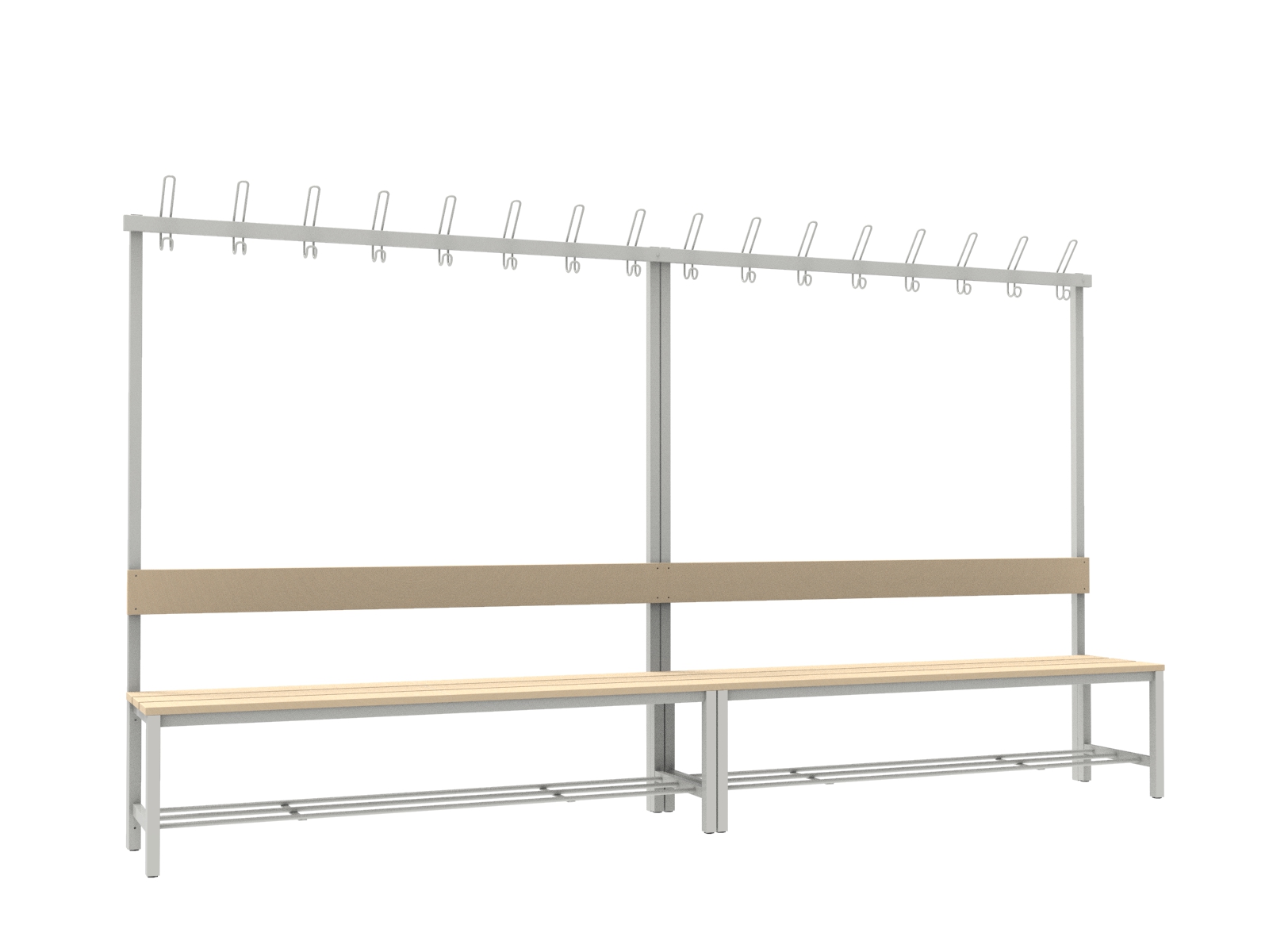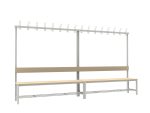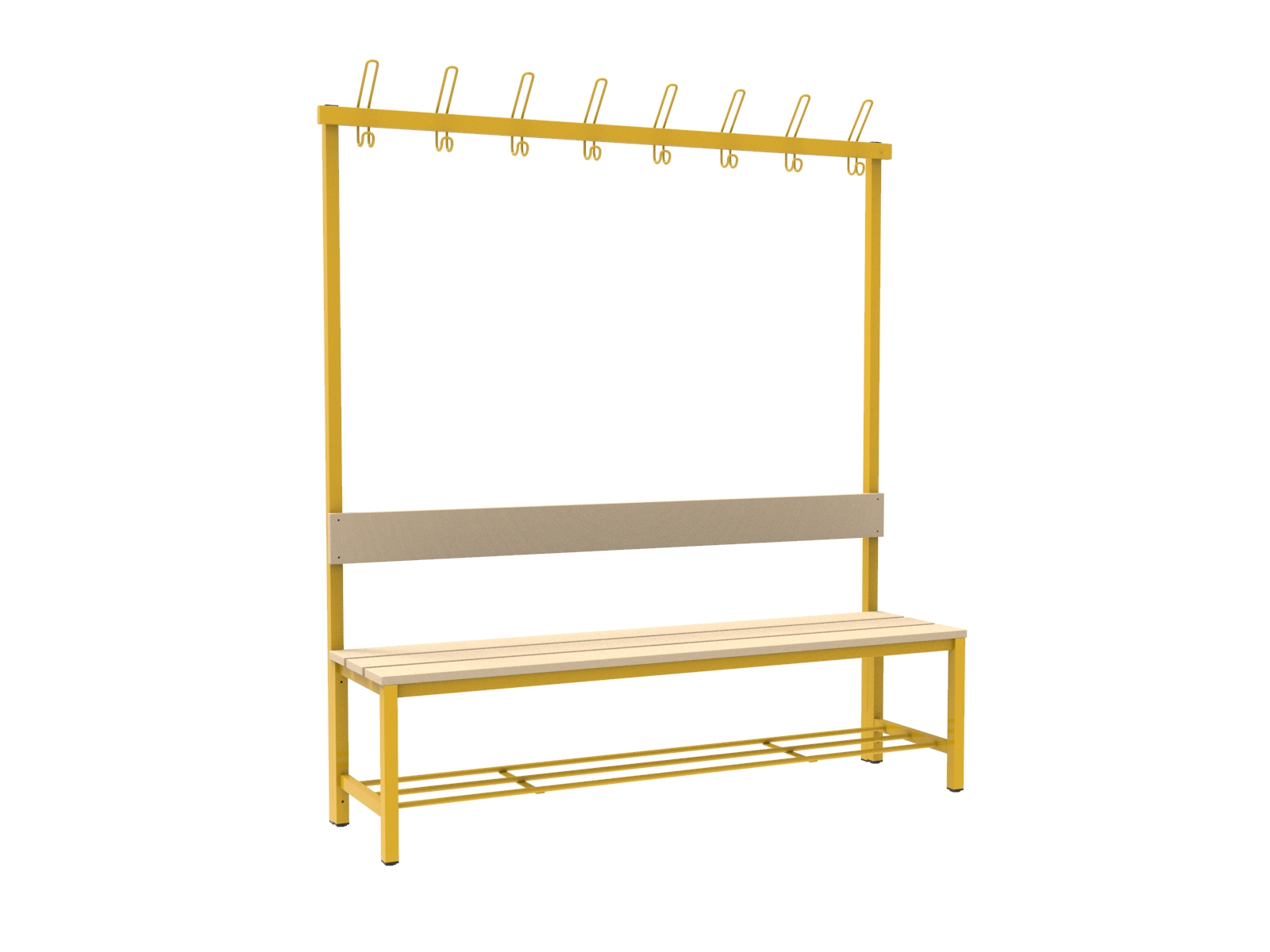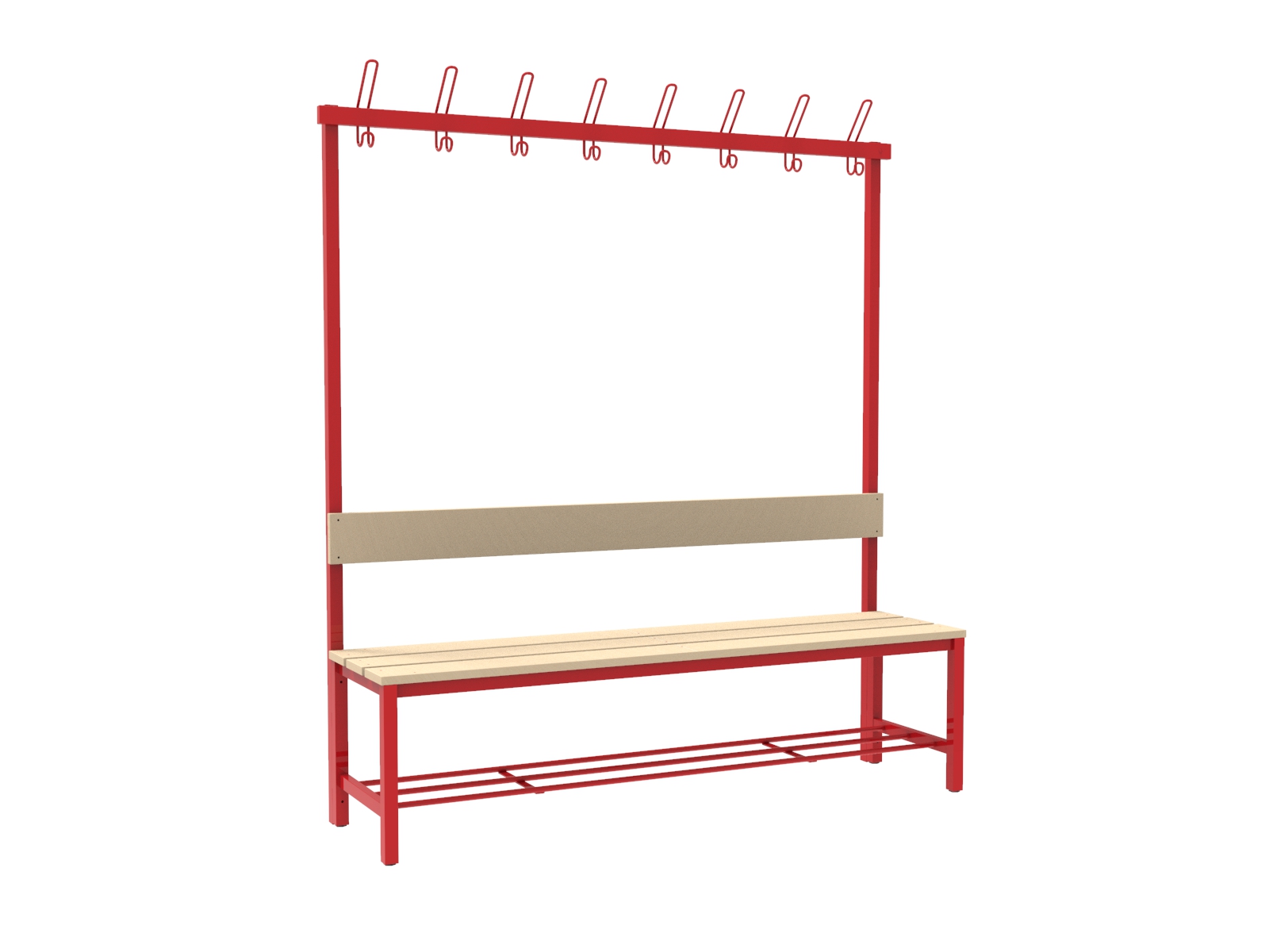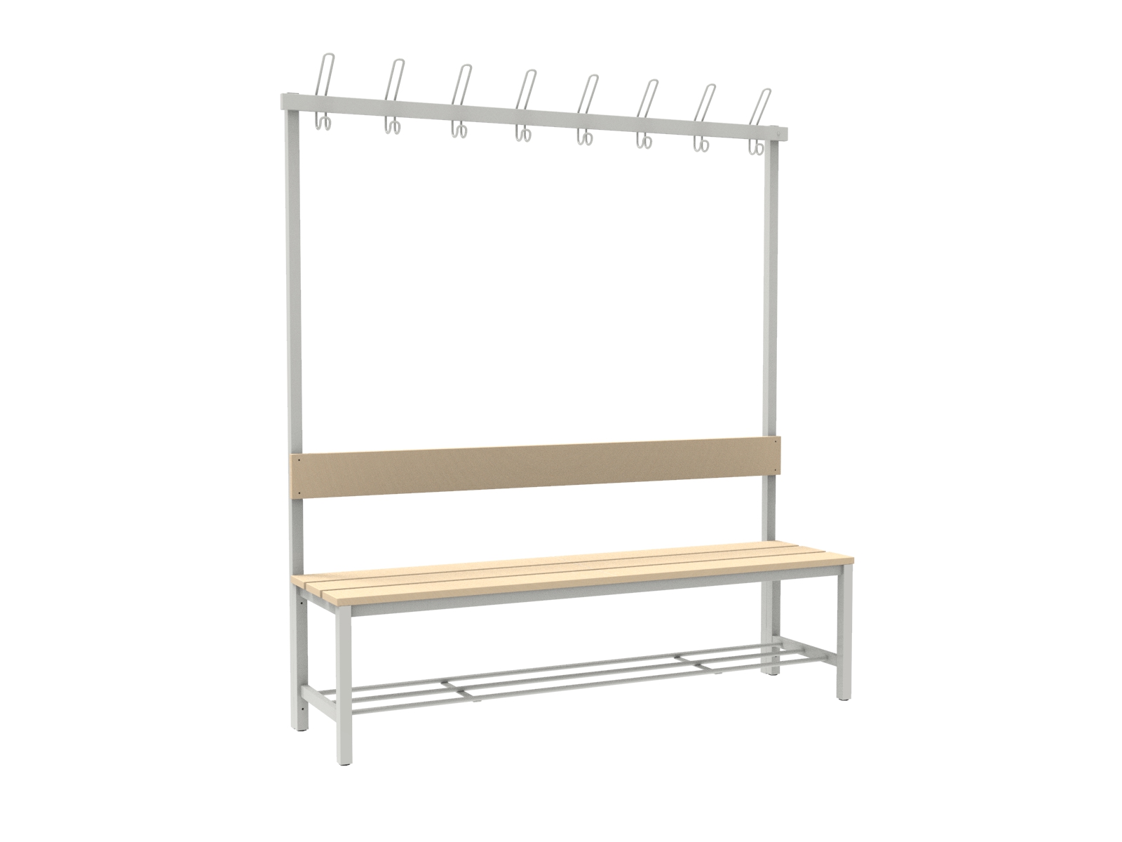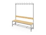 A vázszerkezet elektosztatikus porszórással felületkezelt 30×30 mm-es zártszelvényből készül 8 db rugalmas ruhaakasztó kampóval. A cipőtartó rács 13 mm-es acélcső pálcákból áll. A szintezhető lábdugók segítenek kiküszöbölni a padló egyenetlenségeit. Az ülőfelület és a háttámla lakkozott I. osztályú borovi fenyő lécekből készül.