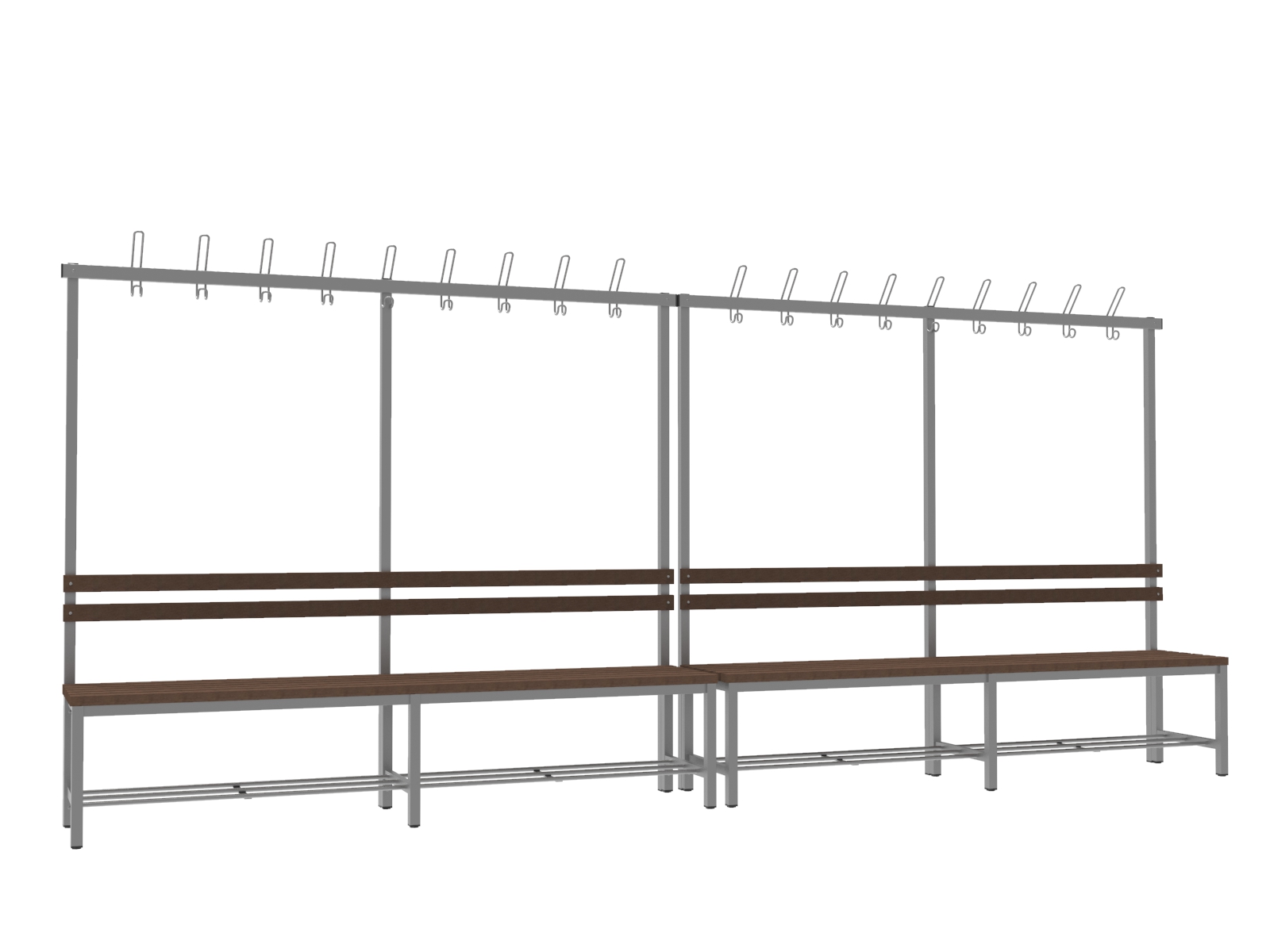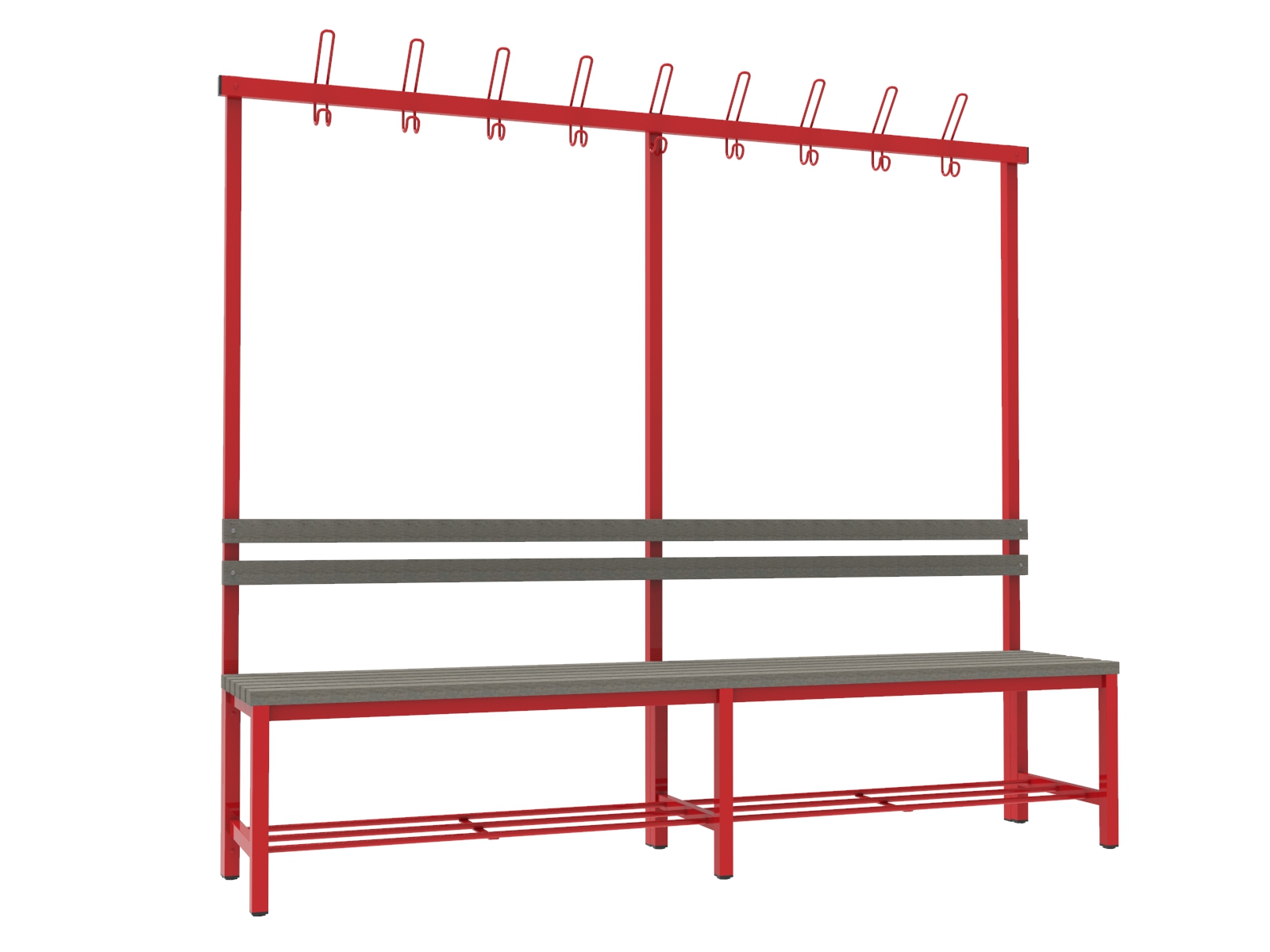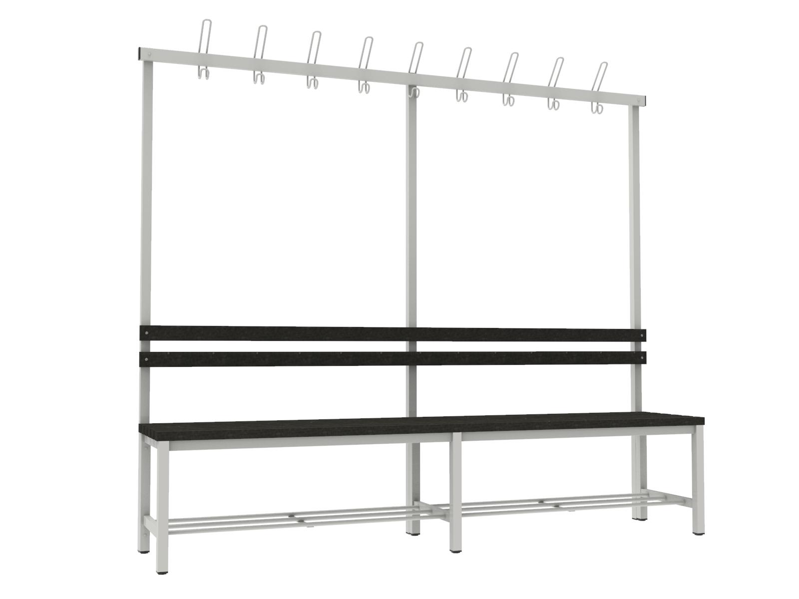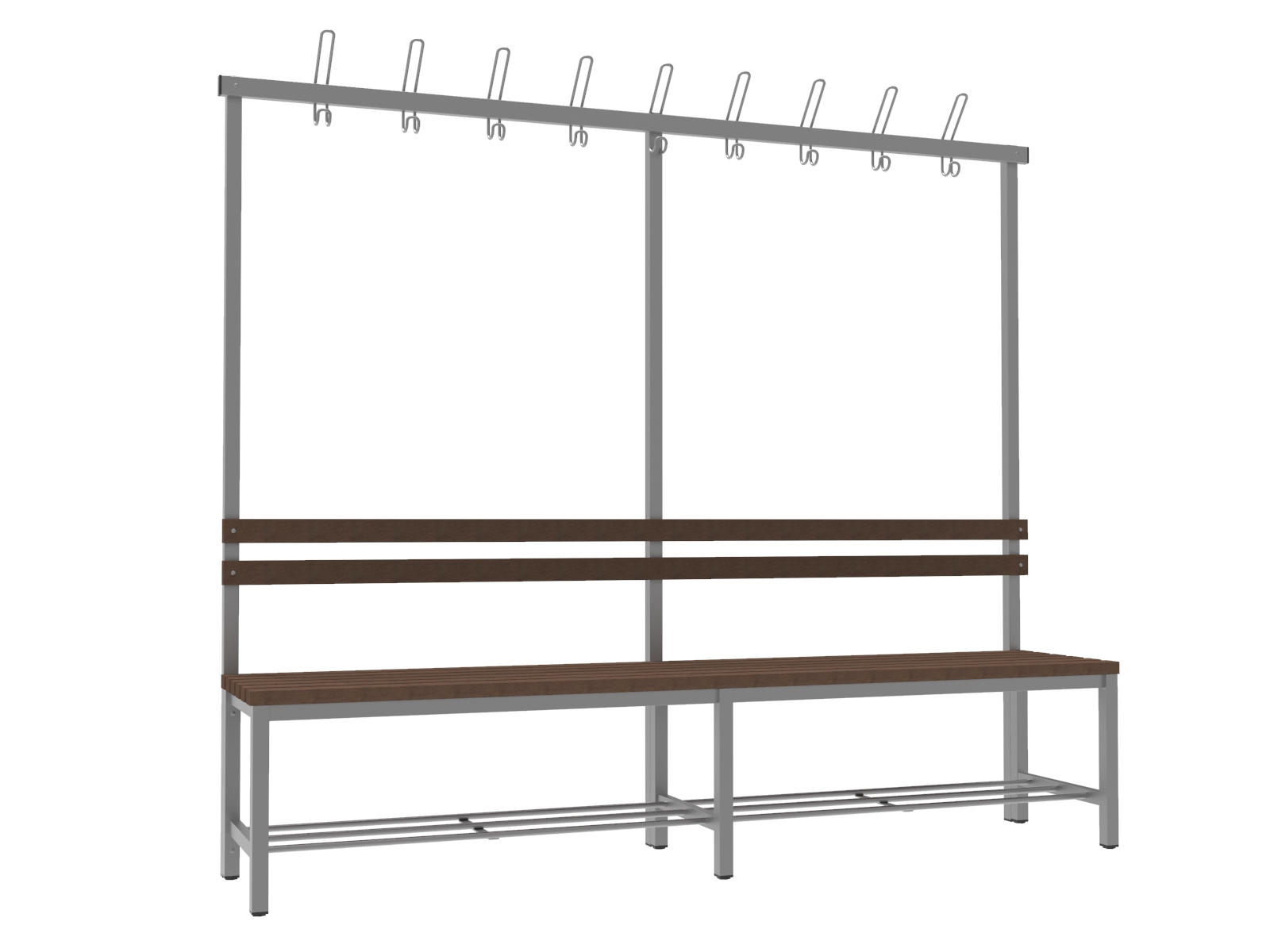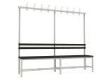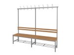 A vázszerkezet elektosztatikus porszórással felületkezelt 30×30 mm-es zártszelvényből készül 9 db rugalmas ruhaakasztó kampóval. A cipőtartó rács 13 mm-es acélcső pálcákból áll. A szintezhető lábdugók segítenek kiküszöbölni a padló egyenetlenségeit. Az ülőfelület karbantartást nem igénylő WPC lécekből készül. A WPC lécek (Wood Plastic Composite) fa–műanyag kompozitból készülnek, amely faforgácsból és különböző hőre lágyuló műanyagokból állnak. A kompozit fatartalma 60%. Ellenállnak a korróziónak és a rothadásnak is. Rendkívül tartósak és ellenállnak a vízben található, a fát megtámadó organizmusoknak is.