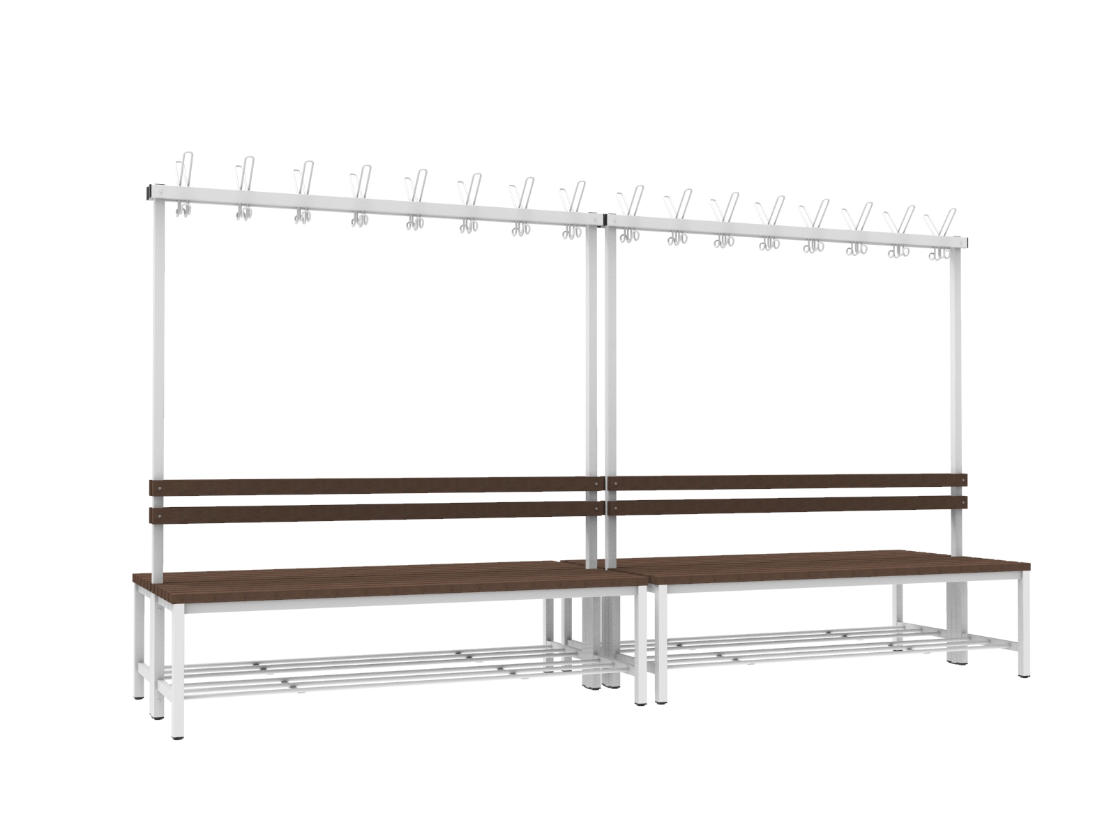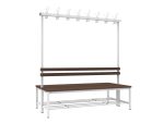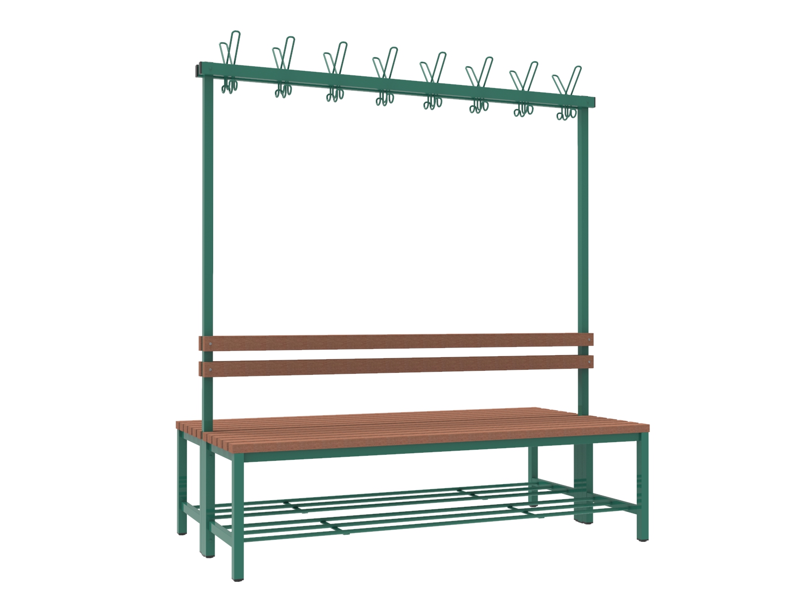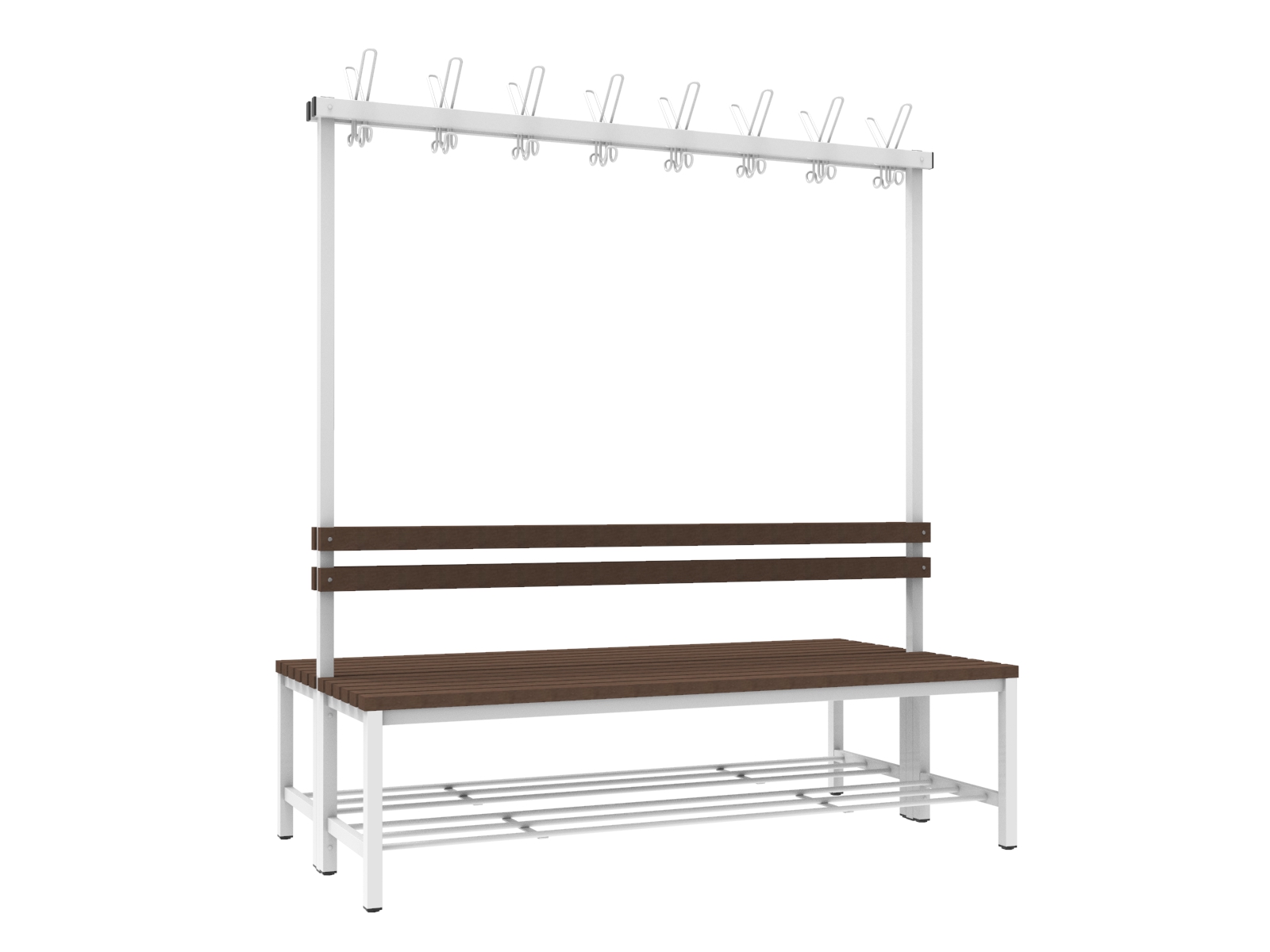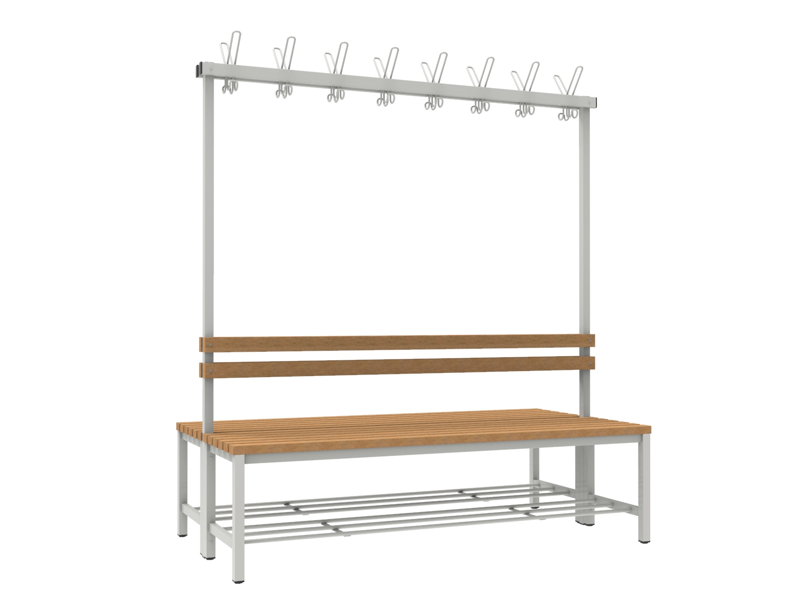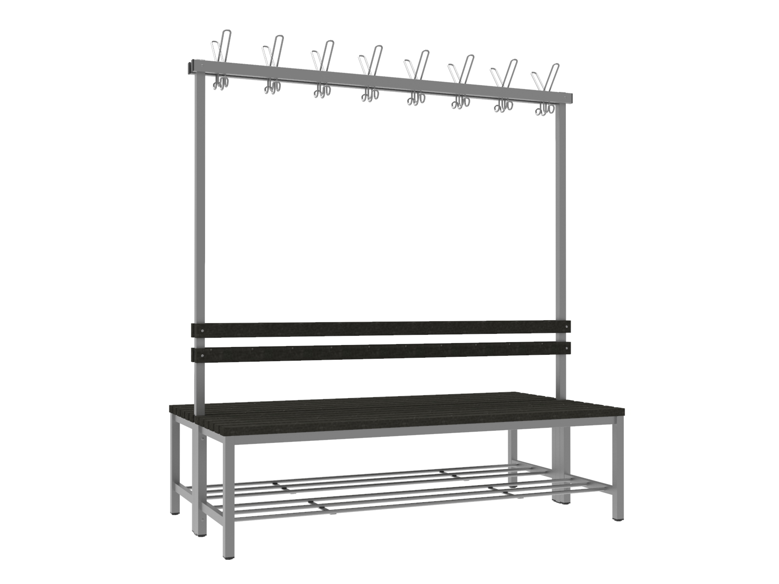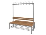 A vázszerkezet elektosztatikus porszórással felületkezelt 30×30 mm-es zártszelvényből készül 16 db rugalmas ruhaakasztó kampóval. A cipőtartó rács 13 mm-es acélcső pálcákból áll. A szintezhető lábdugók segítenek kiküszöbölni a padló egyenetlenségeit. Az ülőfelület és a háttámla karbantartást nem igénylő WPC lécekből készül. A WPC lécek (Wood Plastic Composite) fa–műanyag kompozitból készülnek, amely faforgácsból és különböző hőre lágyuló műanyagokból állnak. A kompozit fatartalma 60%. Ellenállnak a korróziónak és a rothadásnak is. Rendkívül tartósak és ellenállnak a vízben található, a fát megtámadó organizmusoknak is.