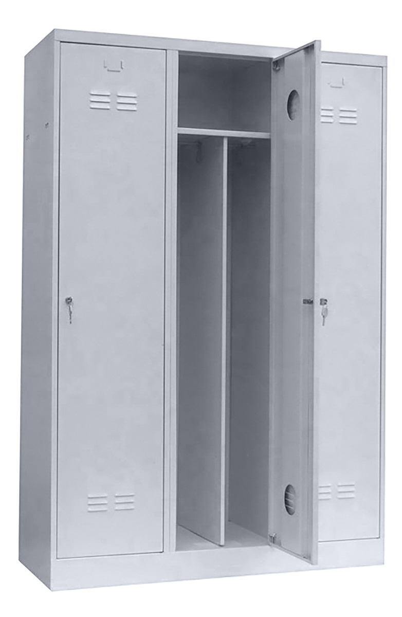 A FittMet fém öltözőszekrény teljes felületén elektrosztatikus porszórással festett hajlított acéllemez korpusszal és ajtóval készül. Szoklis kivitelben. A válaszfal lehetővé teszi a munkaruha és az utcai ruházat elkülönítését. Alapfelszereltség: ruhaakasztó rúd ruhakampóval, kétkulcsos biztonsági zár, ajtón kopoltyúszerű szellőztetés, névcímke tartó, kalaptartó polc.