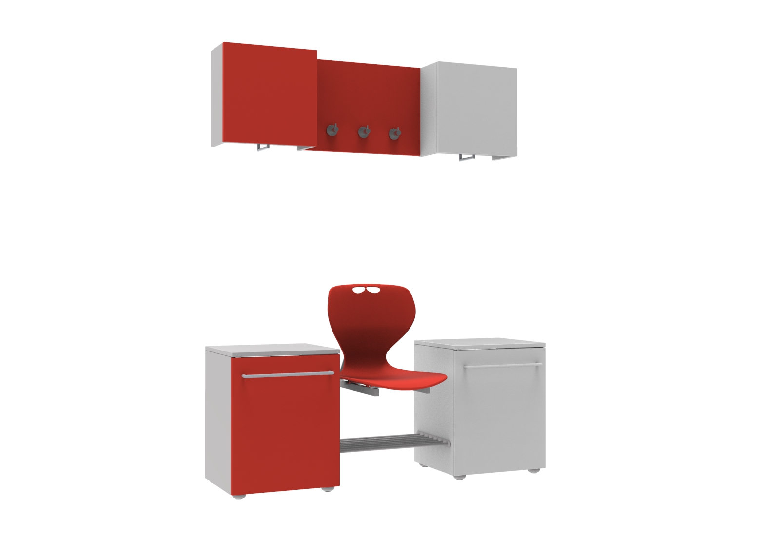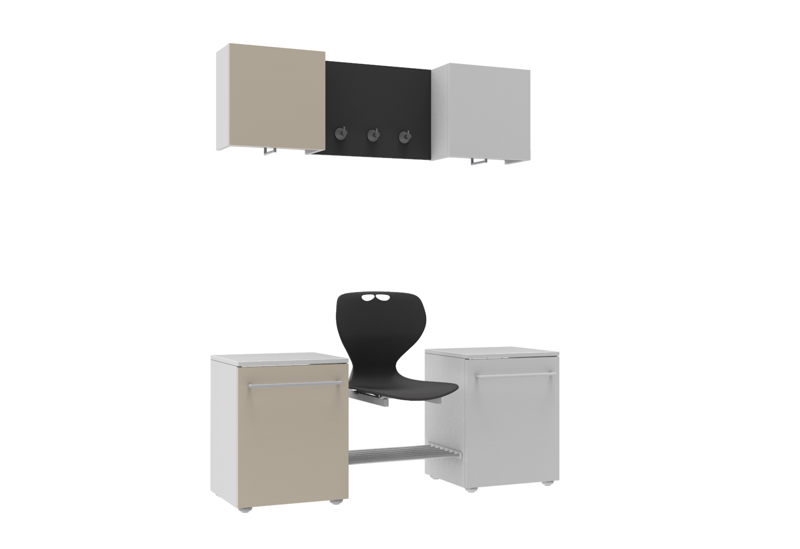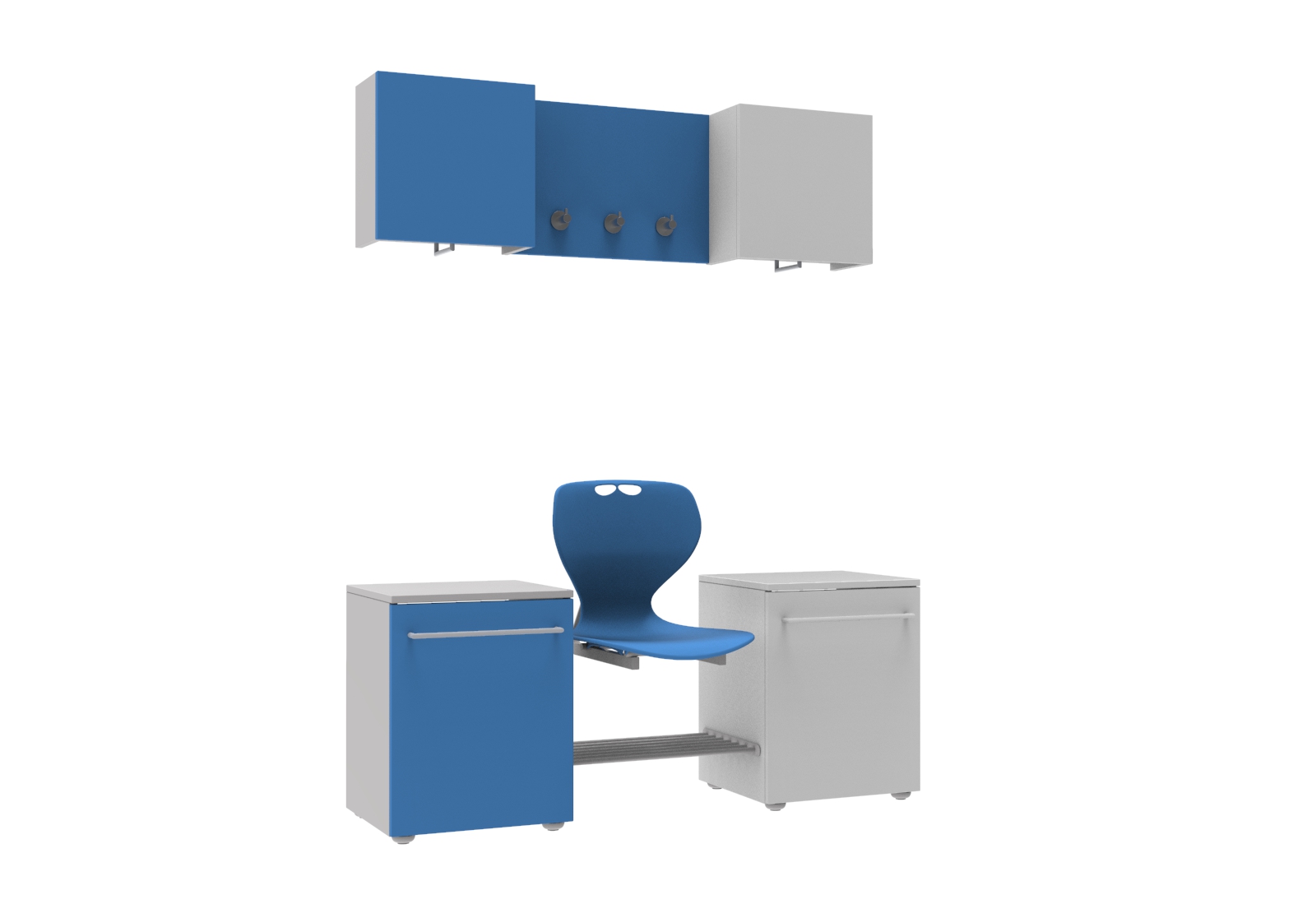 A szekrények és az akasztó panel 18 mm-es laminélt bútorlapból készül ABS élzárással. Az ülőfelület Flex műanyag vandálbiztos törhetetlen palást, 5 különböző színben választható. A pallástot, a felső szekrényt és a fogas panelt a falhoz kell rögzíteni. Minden sportoló számára kényelmes, tágas helyet biztosít. A szett tartalma: 1 db felső szekrény felnyíló ajtóval, vállfatartóval mérete: 40x40x20 cm, 1 db akasztópanel 3 db akasztóval, 1 db fiókos szekrény mérete: 40x57x40 cm, 1 db Flex palást, 1 db cipőtartó rács.