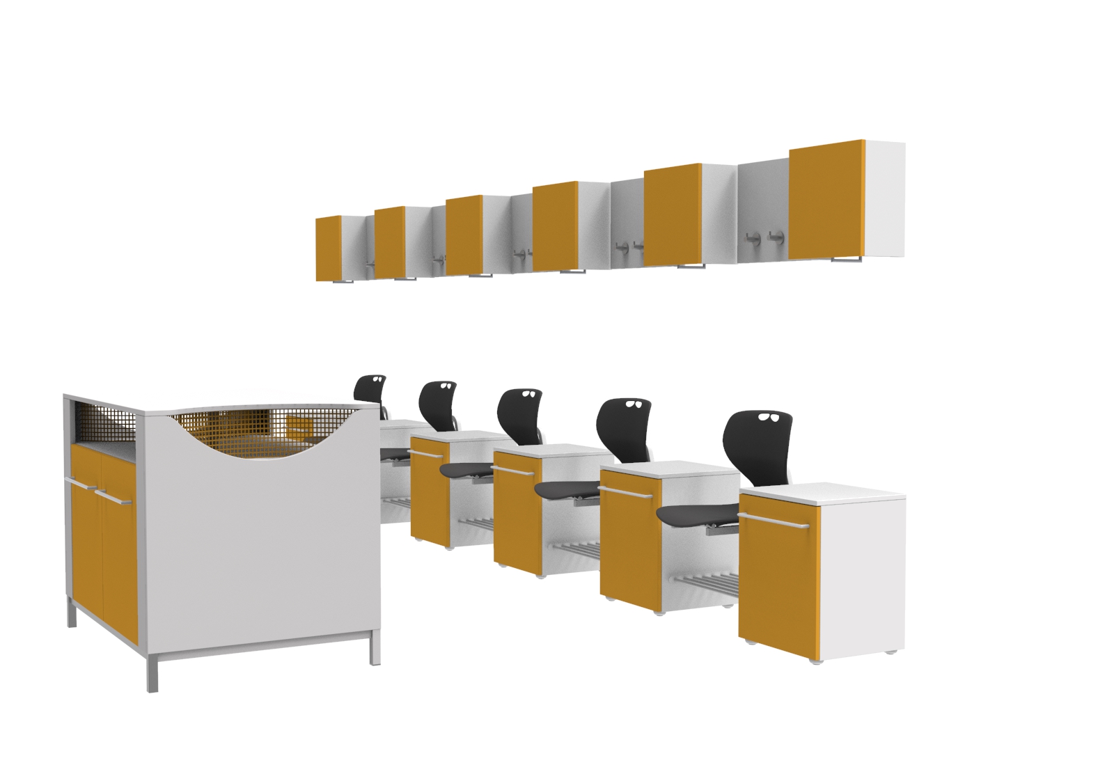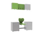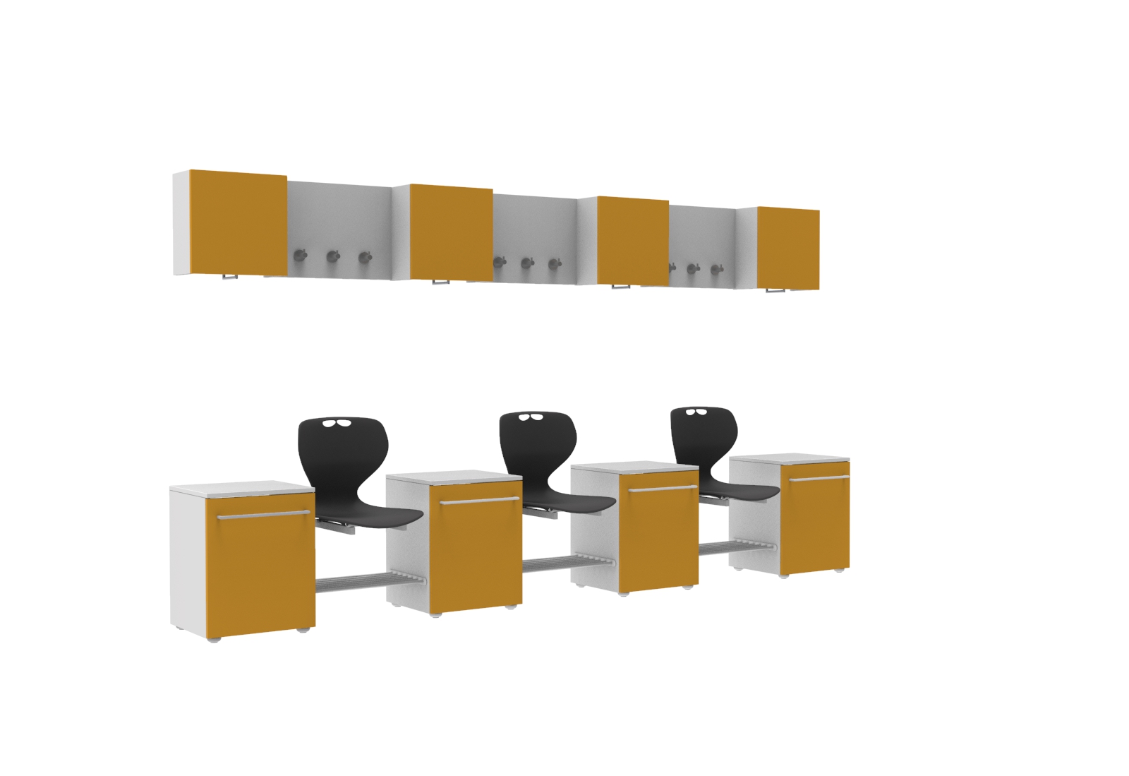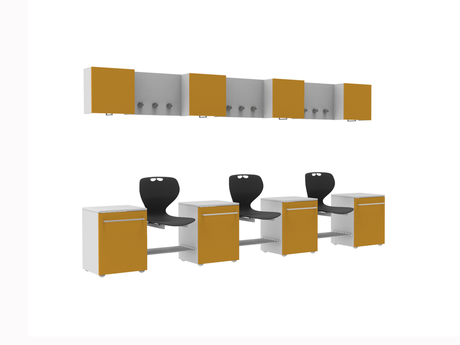 A szekrények és az akasztó panel 18 mm-es laminélt bútorlapból készül ABS élzárással. Az ülőfelület Flex műanyag vandálbiztos törhetetlen palást, 5 különböző színben választható. A pallástot, a felső szekrényt és a fogas panelt a falhoz kell rögzíteni. Minden sportoló számára kényelmes, tágas helyet biztosít. A szett tartalma: 1 db felső szekrény felnyíló ajtóval, vállfatartóval mérete: 40x40x20 cm, 1 db akasztópanel 3 db akasztóval, 1 db fiókos szekrény mérete: 40x57x40 cm, 1 db Flex palást, 1 db cipőtartó rács.
