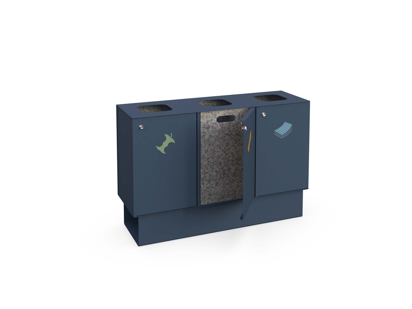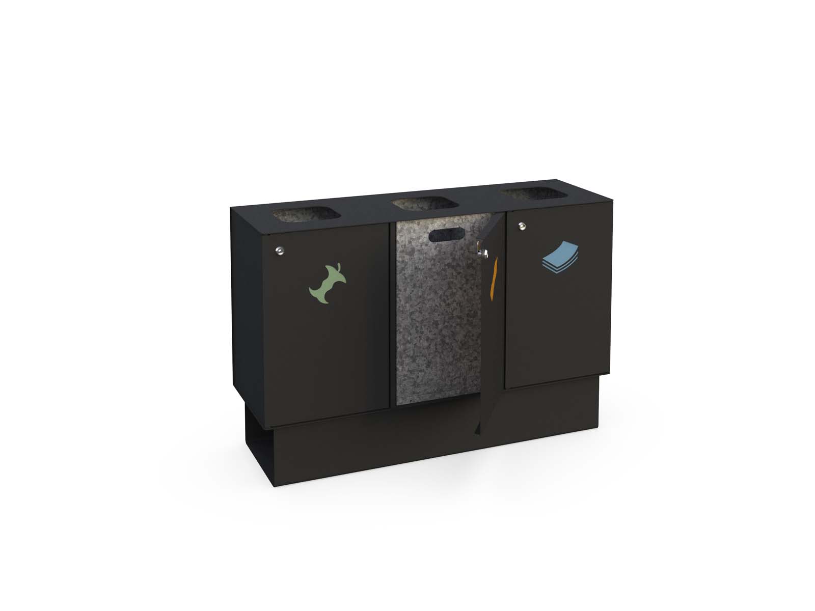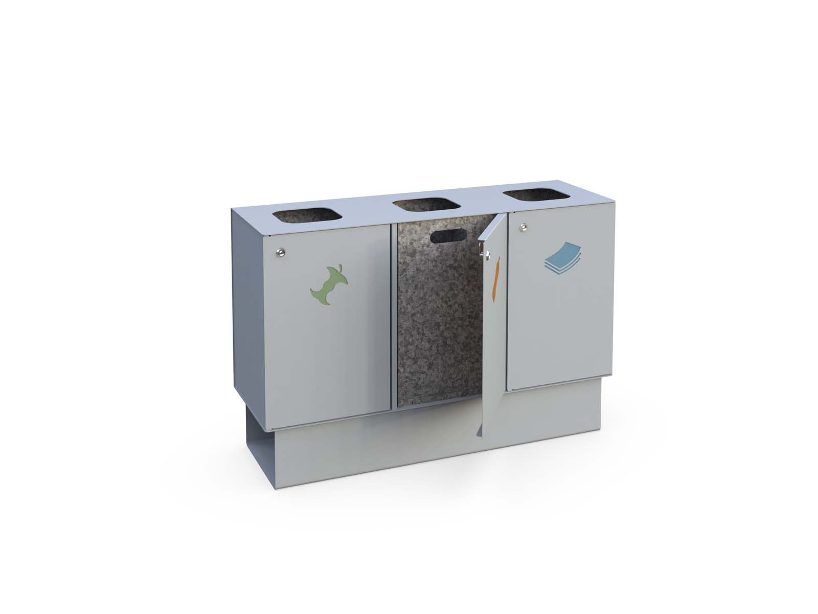 Forte A és Forte B új fejlesztésű szelektív hulladékgyűjtőnk 3mm vastag horganyzott lemezből készül, választható színű elektrosztatikus porszórással. A kivehető betétek anyaga is horganyzott acéllemez. 3x83L űrtartalom, zárható ajtók. Lecsavarozható kivitel. Kültérre és beltérre is egyaránt ajánjuk.