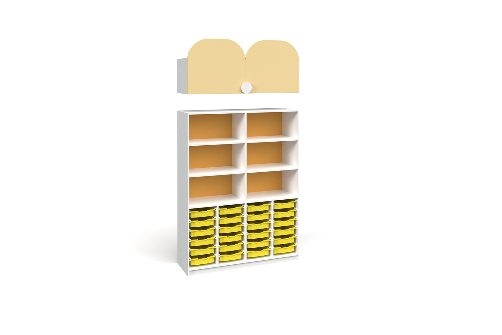 Óvodák és bölcsődék számára kialakított óvodai szekrény. A Jerry óvodai bútor (bölcsődei bútor) felső szekrény eleme 18 mm-es laminált bútorlapból, ABS élzárással készül. Két ajtóval, függőlegesen osztott kivitellel, festett fém fogantyúkkal. A letisztult formavilággal rendelkező Jerry termékcsalád egyes elemei szabadon variálhatóak, így egyedi szekrénysorok összeállítására is lehetőség nyílik.OVB-023-12-F Jerry felső szekrény csak a OVB-023-3 szekrényekhez alkalmazható. A szekrények a képen látható színösszeállításban rendelhetők.