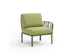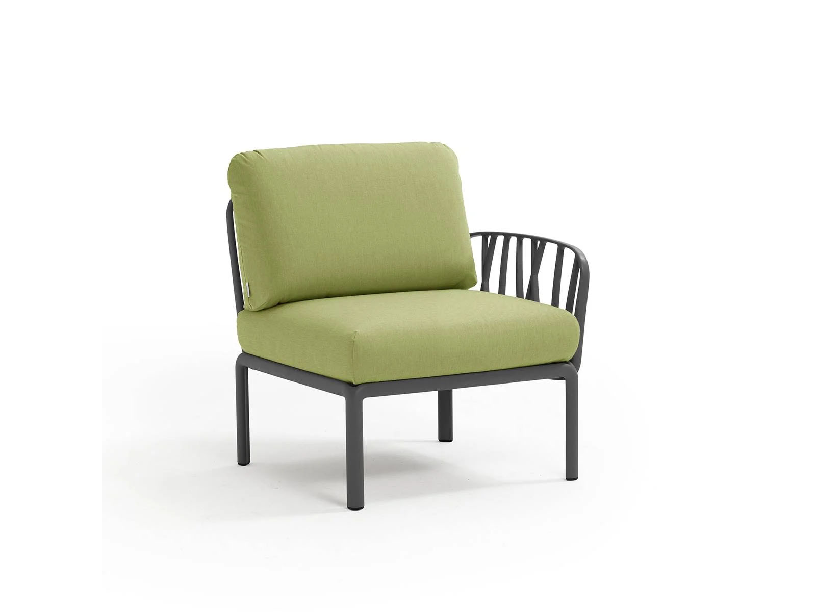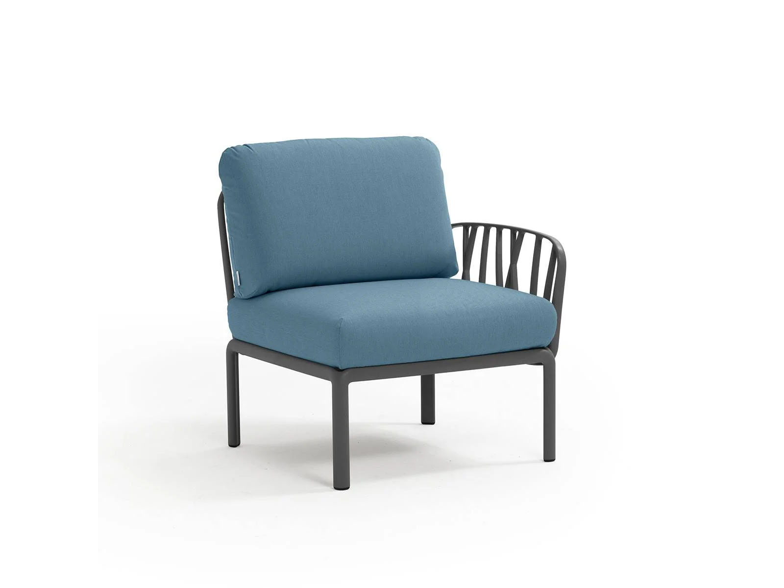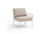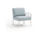 Moduláris elem, üvegszállal erősített UV álló matt felületű műanyag fotel csúszásgátló lábakkal, párnázattal. Minden ülőelemhez csatlakoztatható háttámla vagy karfa akár egyszerre is. Kültérre is ajánlott.