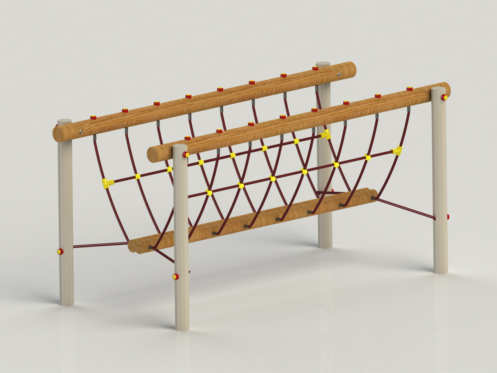 Kültéri, udvari, kerti fajáték óvodák, bölcsődék, játszóterek, parkok számára. Anyaga körmart fenyő, vandálbiztos kötéllel. Területigény: 4,5×5,5 m, esésmagasság: 0,3 m. Játszótéri eszközeink megfelelnek az MSZ-EN 1176-os szabvány biztonságtechnikai előírásainak. Az eszközök elhelyezésénél figyelembe kell venni az esési felületek biztosítását, melyet az MSZ-EN 177-es szabvány szerint az 1 m-t meghaladó szabadesés magasságú játékoknál ütéscsillapító burkolattal kell ellátni. Az ár a telepítés költségeit nem tartalmazza. Ezzel kapcsolatosan kérje külön árajánlatunkat!
