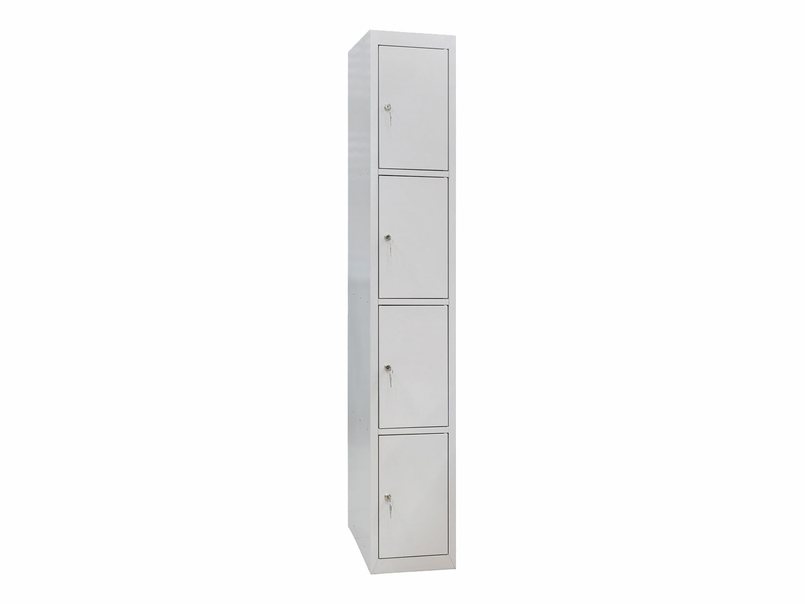 Struktúr felületű elektrosztatikus porszórással festett I. osztályú acéllemezből készül. Kétkulcsos fémbetétes hengerzárral vagy lakatzárral szerelt. Az ajtók kalapprofil merevítéssel készülnek, ami megakadályozza a kifeszíthetőséget. RAL 7035 világosszürke színben.