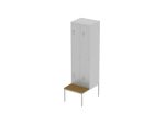 Hosszúajtós 2 személyes kivitel. Struktúr felületű elektrosztatikus porszórással festett I. osztályú acéllemezből készül. Szellőzés az ajtókon keresztül perforációval történik. Kétkulcsos fémbetétes hengerzárral szerelt. Az ajtók kalapprofil merevítéssel készülnek, ami megakadályozza a kifeszíthetőséget. Az ajtókon és a korpuszon elhelyezett szilikon korongok megakadályozzák a hangos becsapódást. Az akasztókampó lehetőséget nyújt a táska, kabát felakasztására, vállfatartóval, kalaptartó polccal. Az ülőfelület WPC lécekből készül. A lábak 30×30 mm-es zártszelvényből készülnek szintezhető lábdugóval. RAL 7035 világosszürke színben.