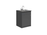 Korpusz és ajtó: 18 mm vastag laminált bútorlap, 2 mm vastag ABS élzárás, biztonsági zárral, munkalap: 12 mm vastag választható színű 12 mm vastag kompaktlemez munkalap ( duroplasztikus anyag, mely valójában melamin gyantával teljesen telített cellulóz rostokbóláll, melyeket magas hőmérsékleten és nagy nyomással préselnek teljesen tömör és homogén anyaggá.A kompakt lemez munkafelületek a melamin gyanta alapanyag miatt valóban jó vegyi és hőállóságúak,a gyártástechnológia révén jó kopásállóságúak és nehezen gyúlékonyak, a hordozó celluloid szálszerkezetrévén kemények és nem repedésérzékenyek, felületük tömör és karcálló) . 1 db csapteleppel, 1 db rozsdamentes mosogató medencével, 1 db szifonnal. Méret: 60x60x88 cm.
