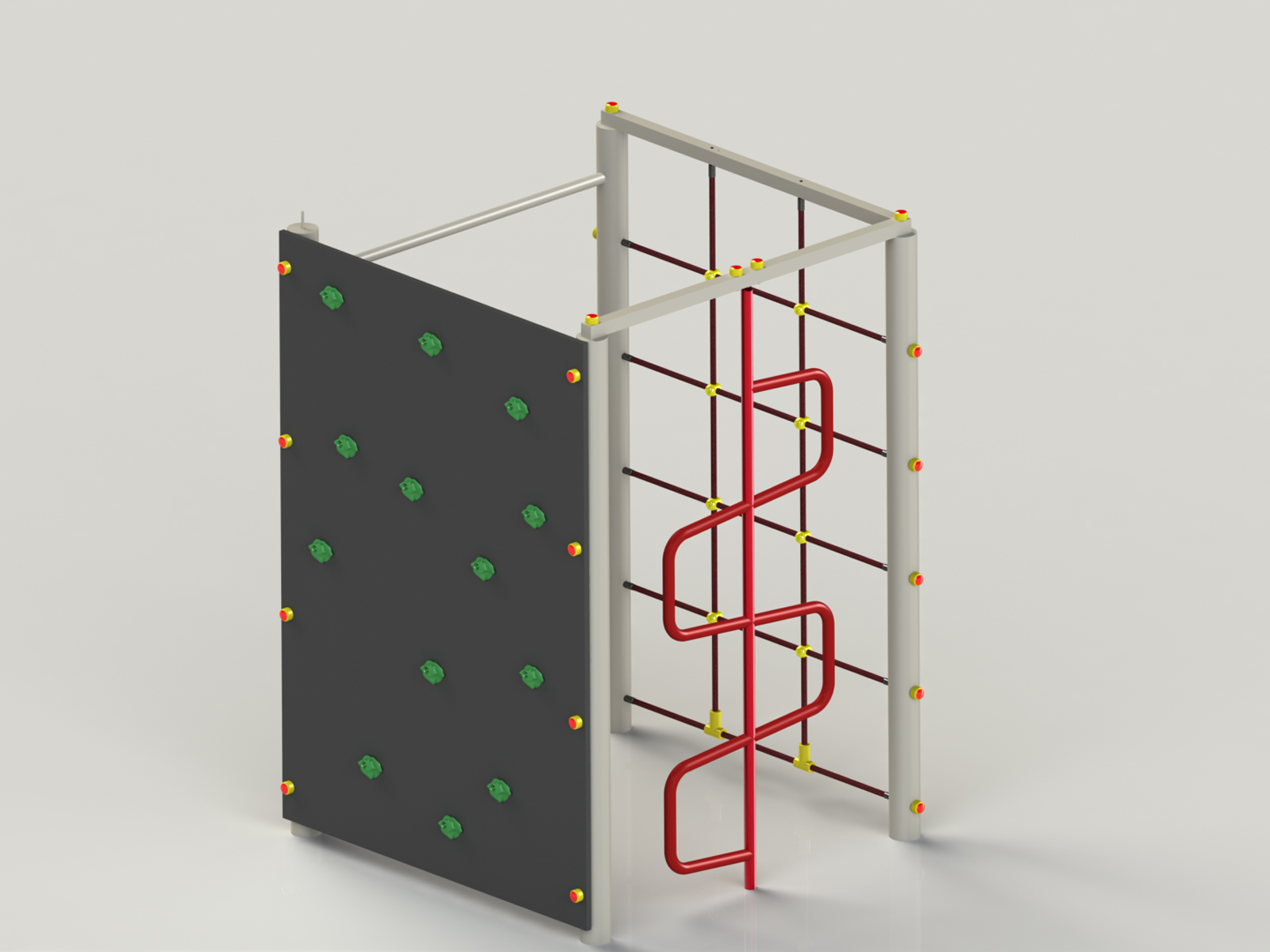 Kültéri, udvari, kerti fajáték óvodák, bölcsődék, játszóterek, parkok számára. Mászófallal, kígyócsővel, kötélmászókával, nyújtóval. Rögzítés és ütéscsillapítás nélkül. Területigény: 5,5×5,5 m, esésmagasság: 1,95 m. Játszótéri eszközeink megfelelnek az MSZ-EN 1176-os szabvány biztonságtechnikai előírásainak. Az eszközök elhelyezésénél figyelembe kell venni az esési felületek biztosítását, melyet az MSZ-EN 177-es szabvány szerint az 1 m-t meghaladó szabadesés magasságú játékoknál ütéscsillapító burkolattal kell ellátni. Az ár a telepítés és ütéscsillapítás költségeit nem tartalmazza. Ezzel kapcsolatosan kérje külön árajánlatunkat!