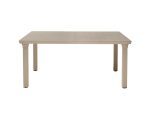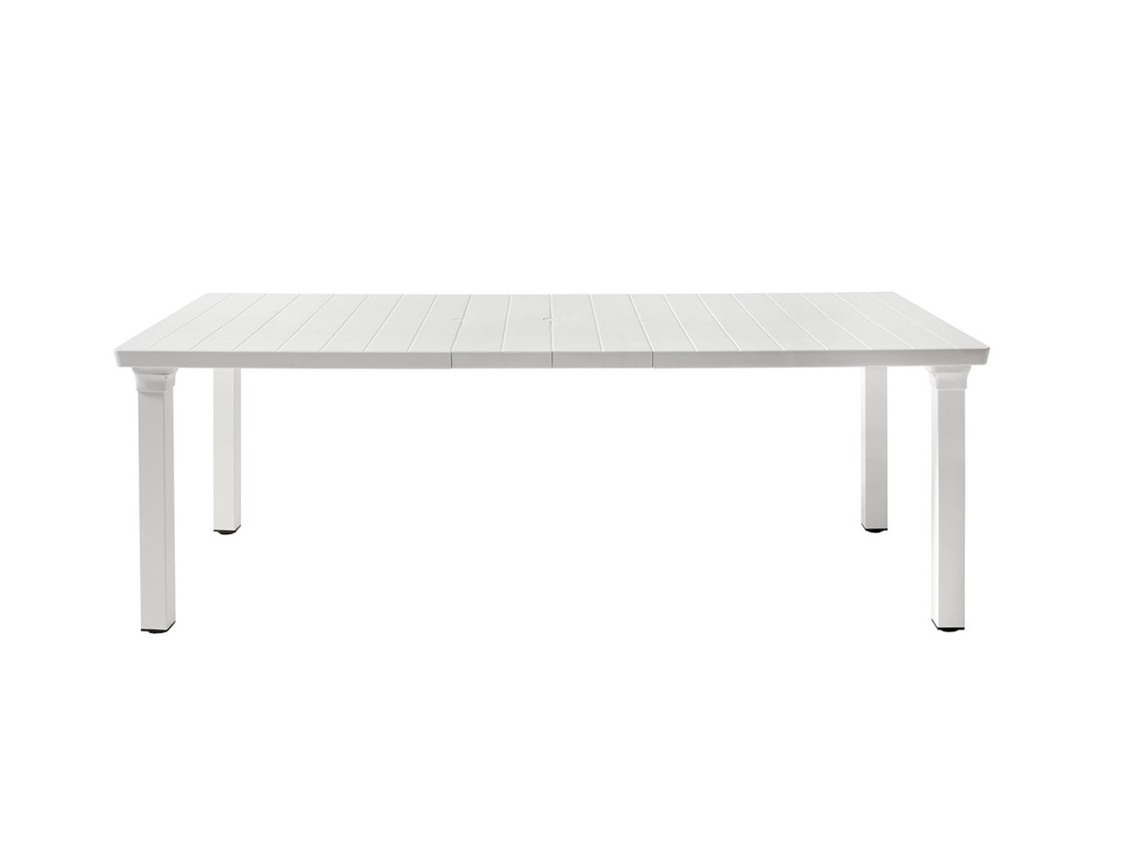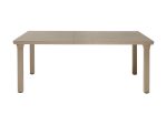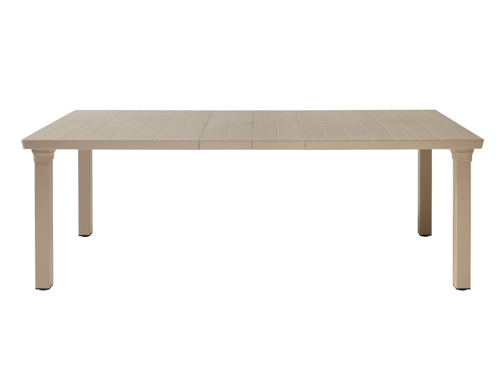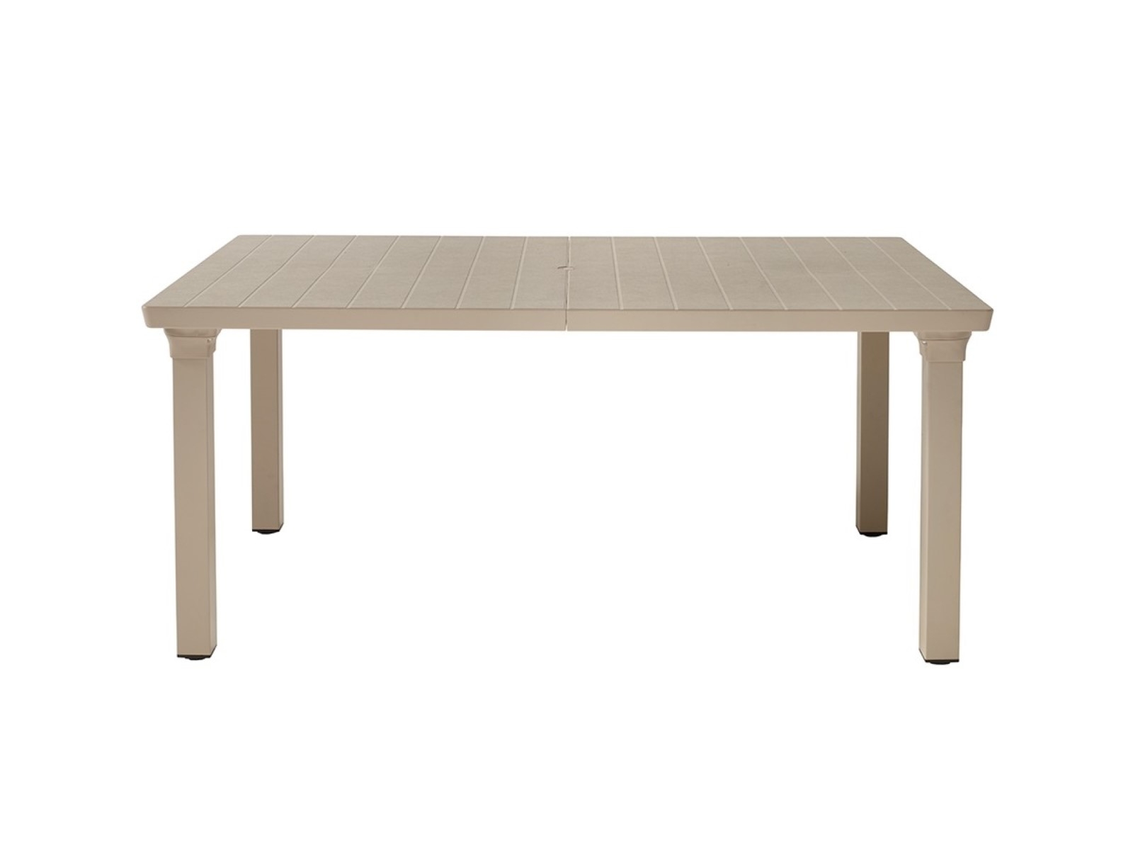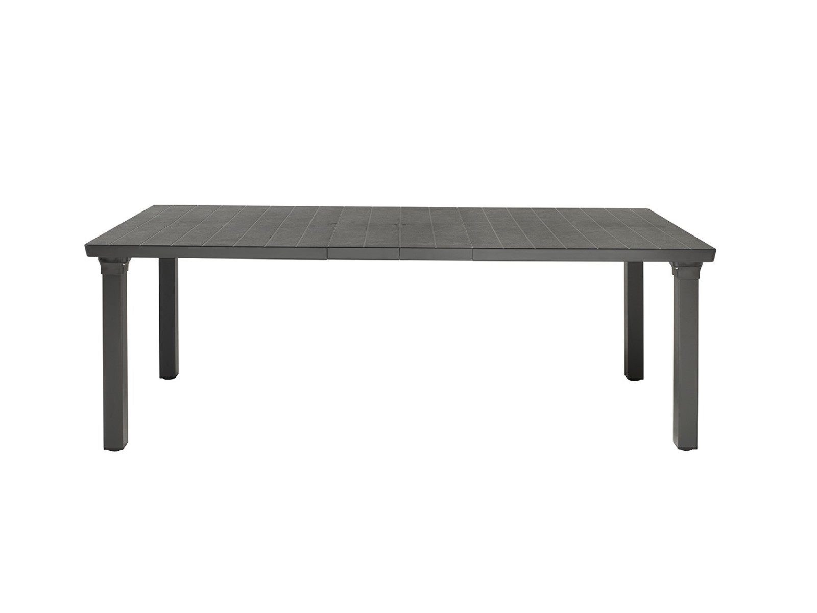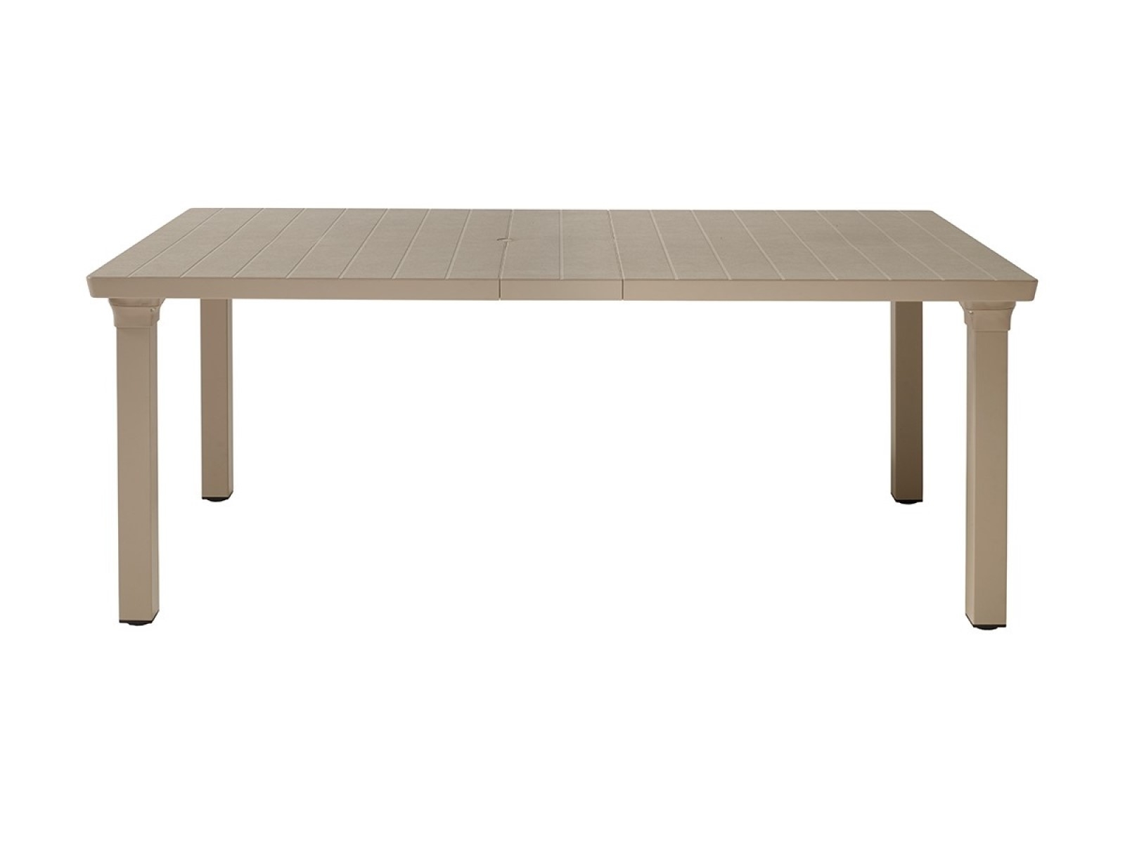 Alumíniumlábú, bővíthető asztal, szintezős lábdugókkal, 170×100cm-es, napernyőlyukkal ellátott, műanyag asztallappal, mely 2 db toldóval 220 cm-ig bővíthető.