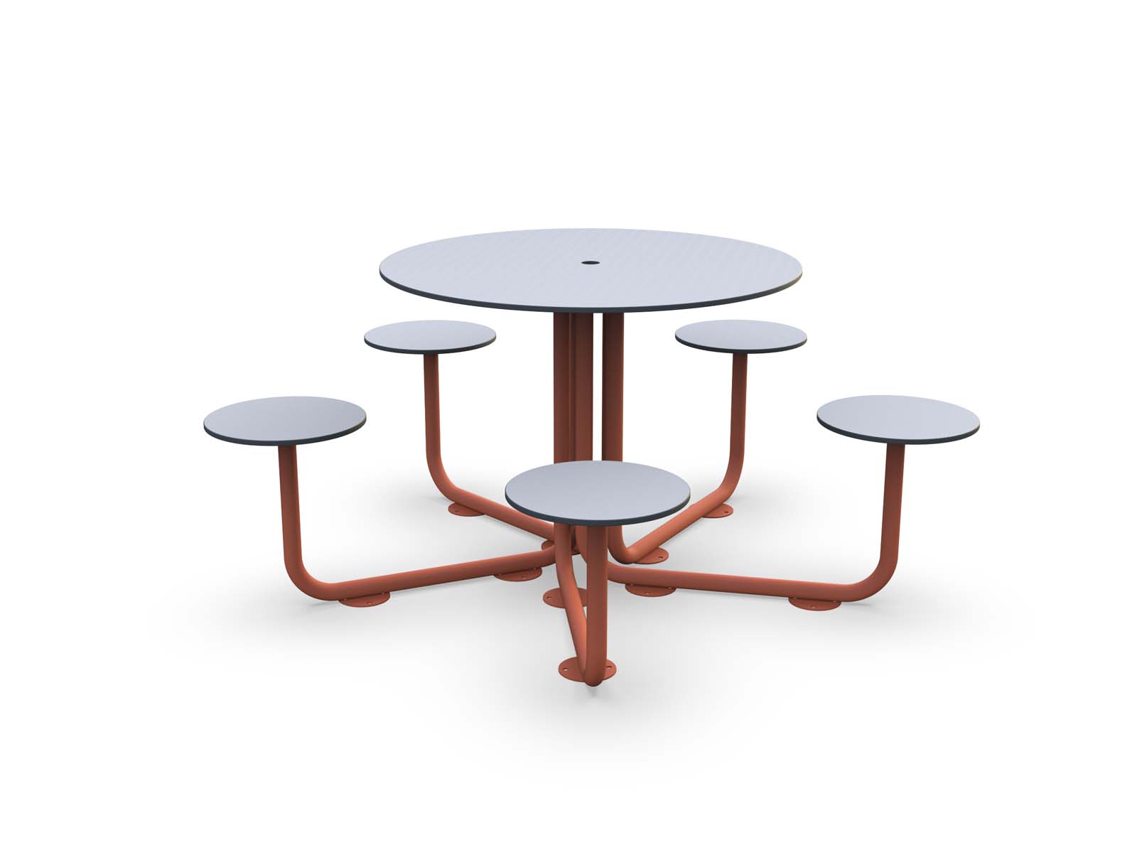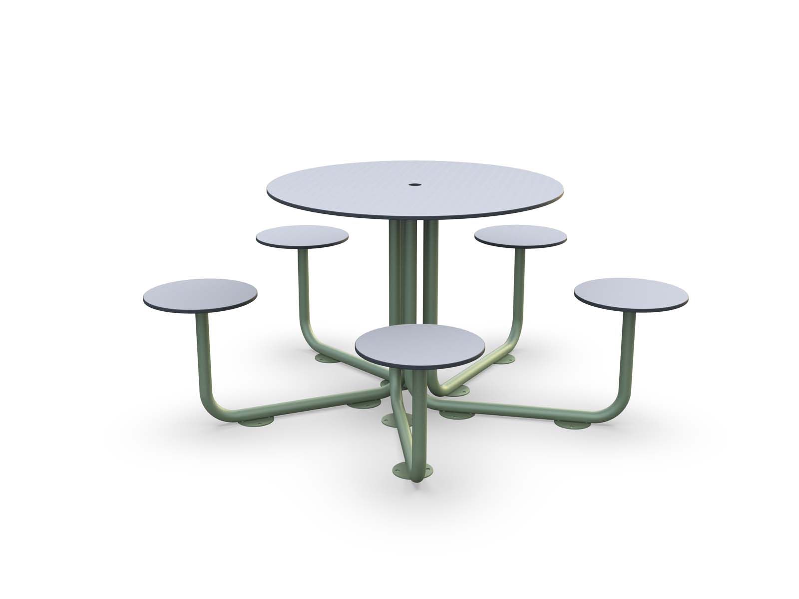 Modern kültéri piknik asztal parkokba és közterekre. Vázszerkezete o40x2 mm-es és o89x2 mm-es horganyzott acélcsőből, valamint 30×30 mm-es zártszelvényből készül.Az o950mm asztallap és az o350mm ülőlapok 12mm vastag víz és UV-álló HPL Exterior kompaktlemezből készülnek. Az asztal közepén napernyő is elhelyezhető. Lecsavarozható kivitelben gyártjuk.