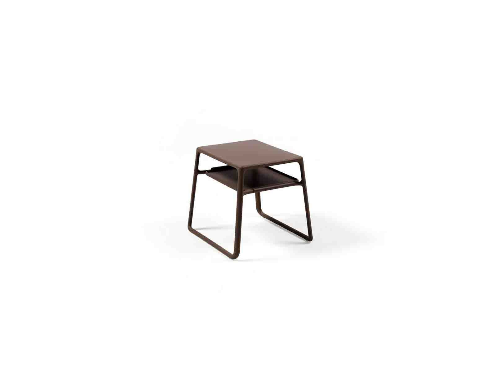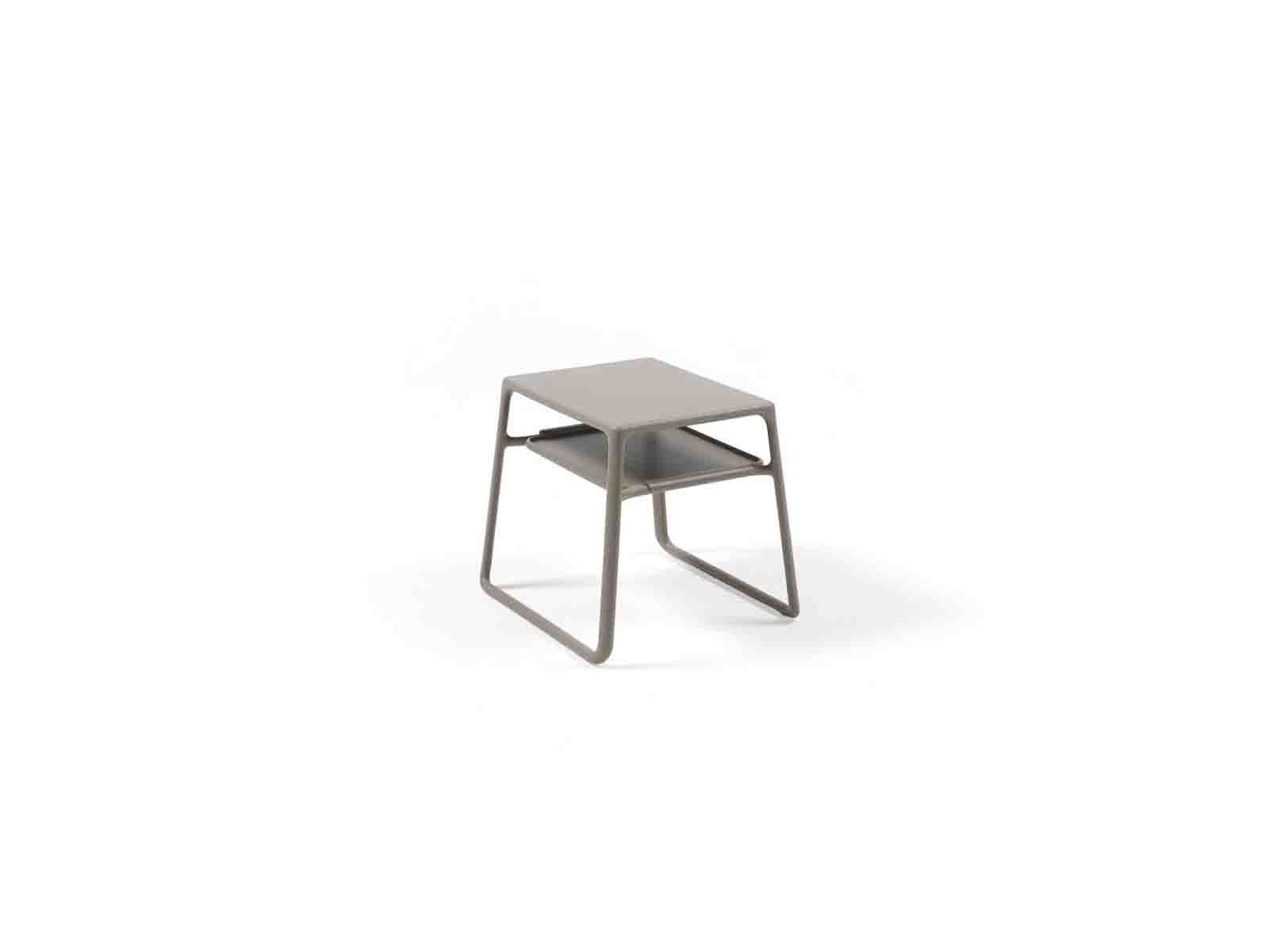 Üvegszállal erősített egyben formaöntött, UV álló matt felületű műanyag kisasztal csúszágátló talppal, kihúzható polccal, mely tálcaként használható. Kültérre is ajánlott.