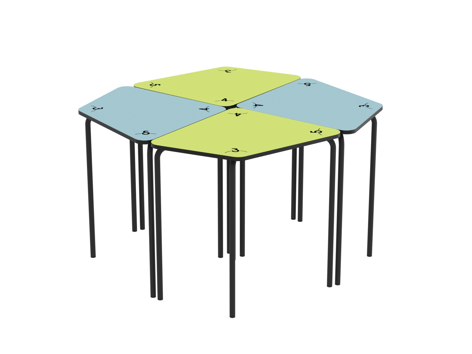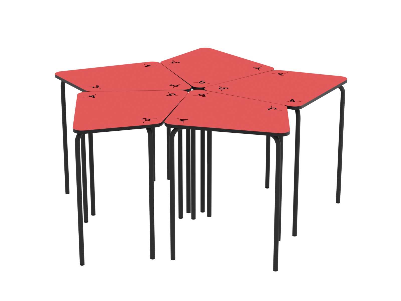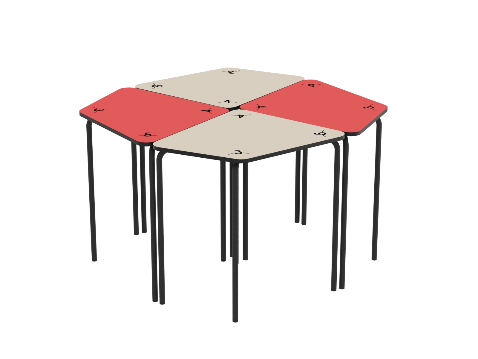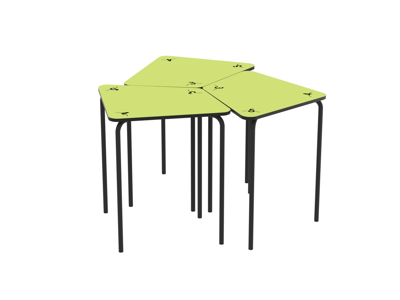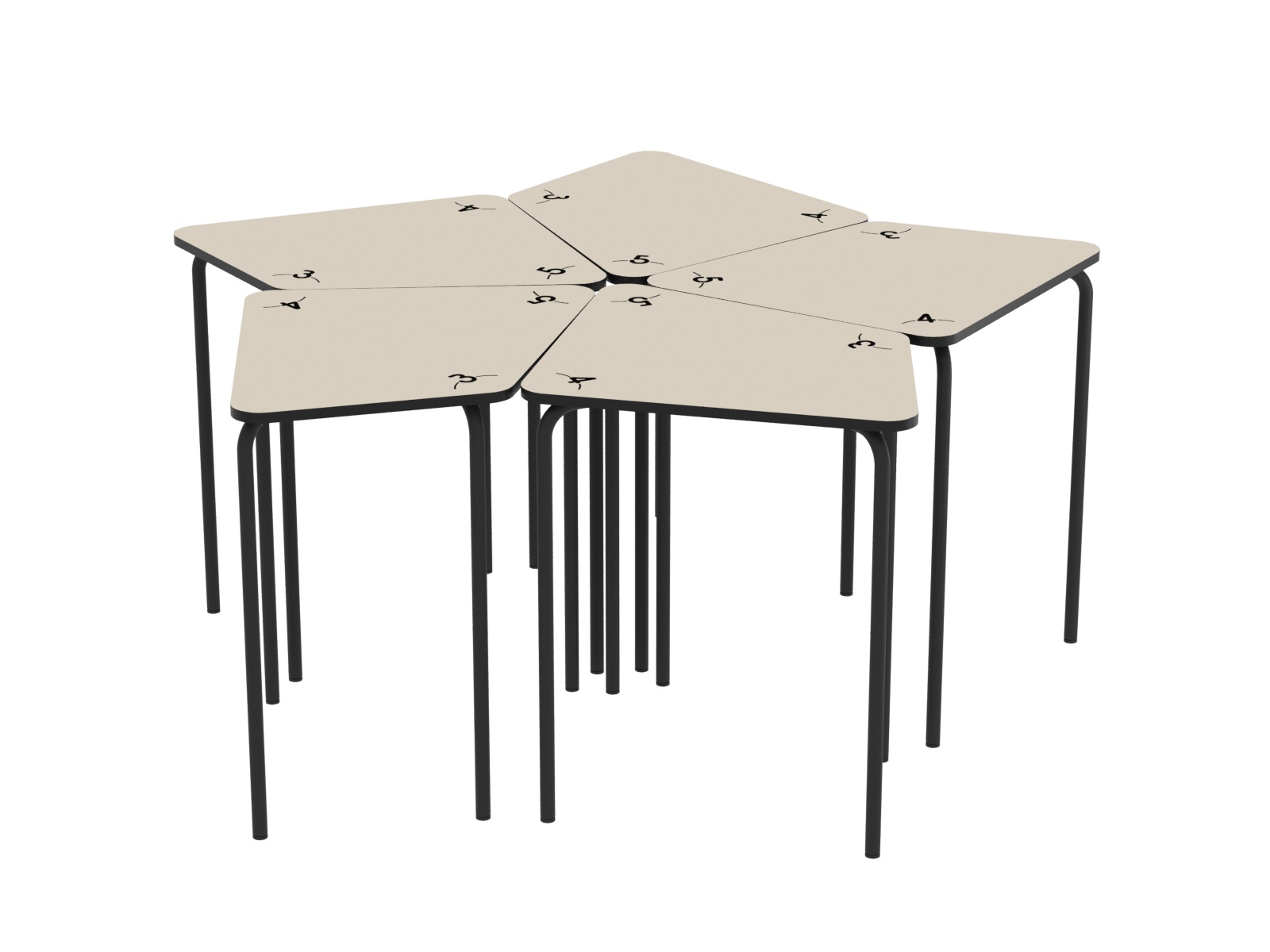 A PROGRAM 3.4.5. asztal legfőbb előnye a könnyű mozgathatóság, rakasolhatóság, amely mellett különös geometriája lehetővé teszi mind a 3, mind a 4, mind pedig az 5 asztal rés nélküli összeillesztését, a sarkok eszerint meg is vannak jelölve. A lábak 25 mm átmérőjű acél cső vázzal készülnek, szintezhető műanyag végzáró elemekkel alkalmazkodnak a talaj egyenetlenségeihez, melyek filc betétesek a burkolat kímélése érdekeben. A fémváz alján gumipufferek óvják az asztallapot az egymásra rakásolás esetén. A különböző uni színű 18 mm vastag laminált asztallapok egységesen 2 mm vastag fekete színű élzárást kapnak. Mivel a szerkezet metrikus csavarokkal van összeszerelve, igény szerint bármikor szét és összeszerelhető.