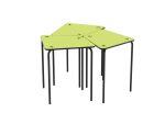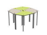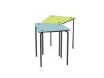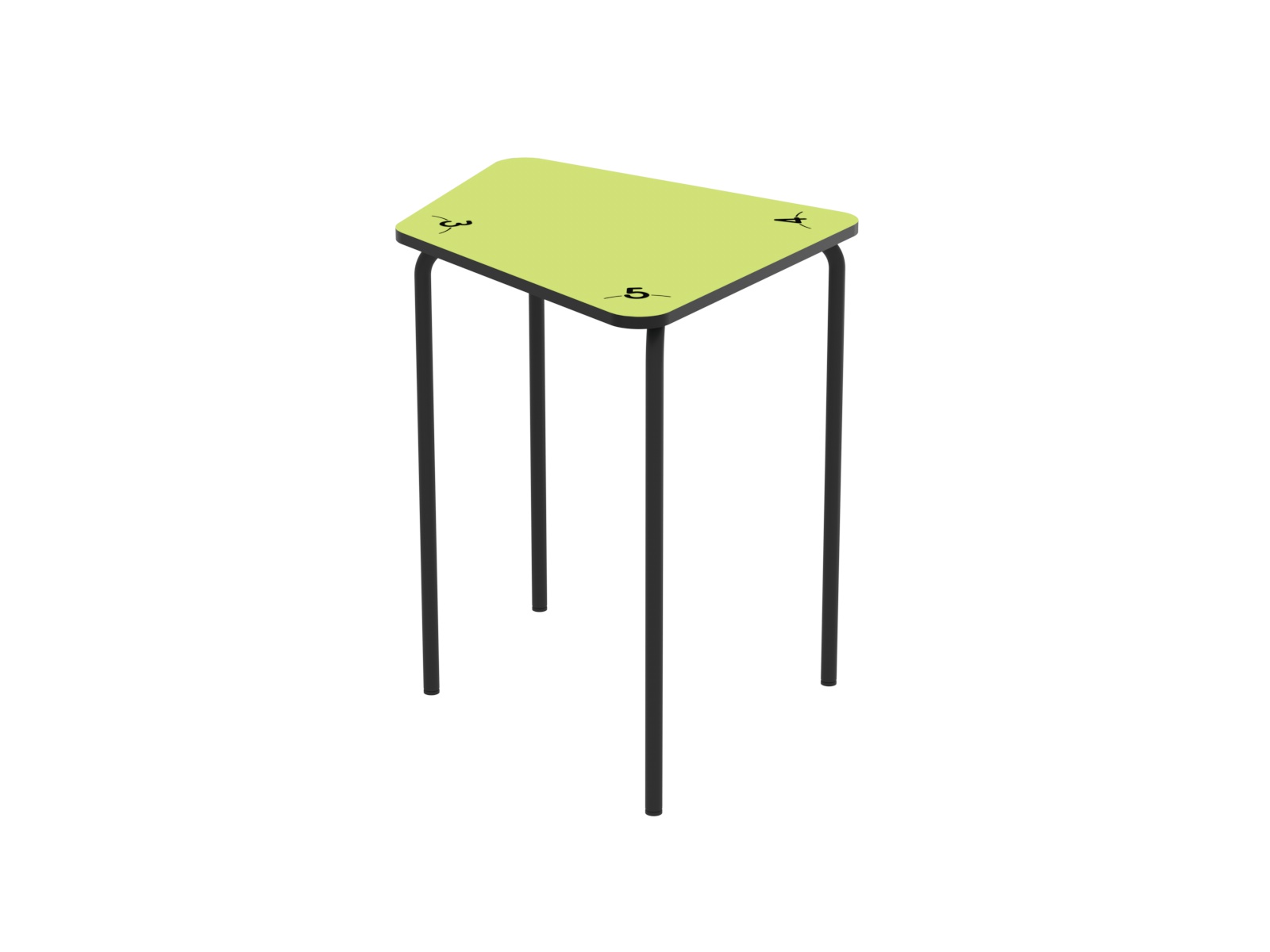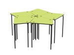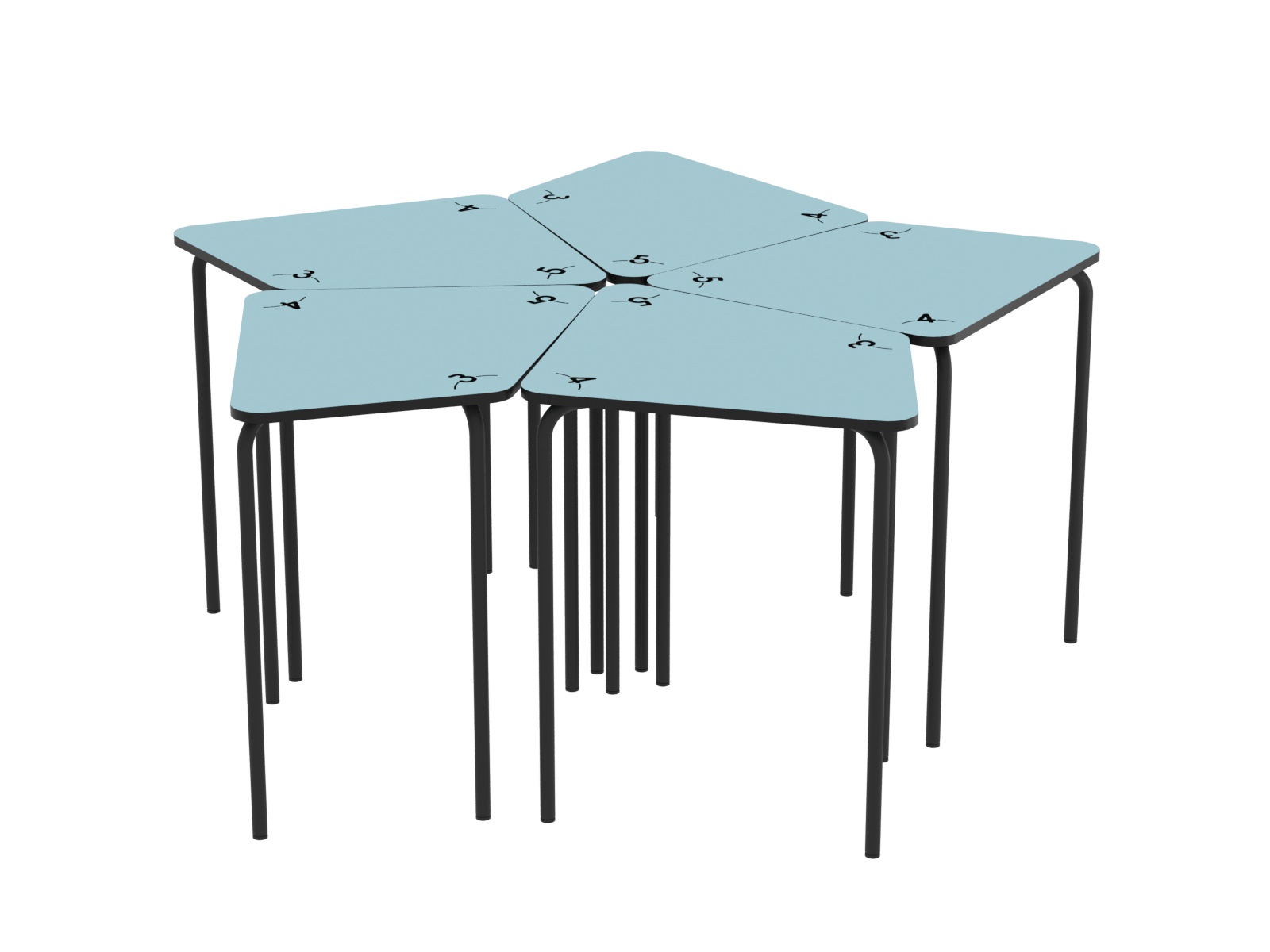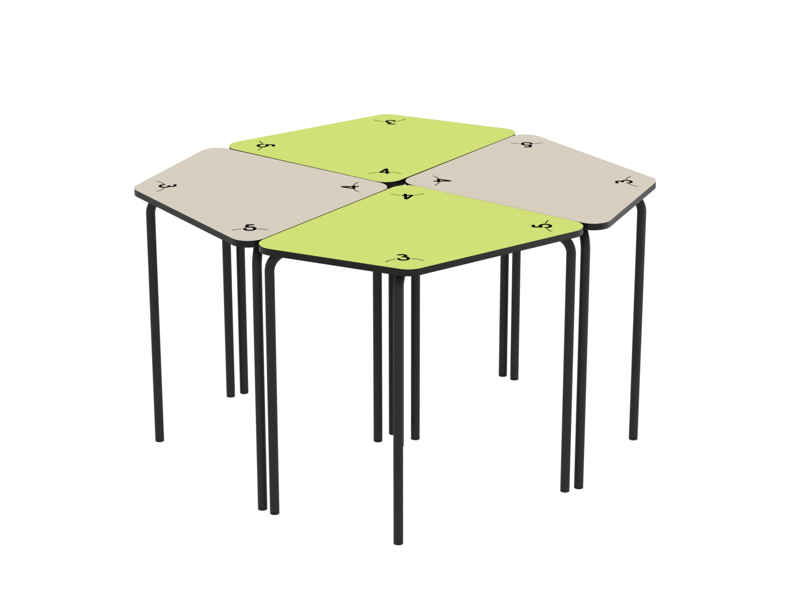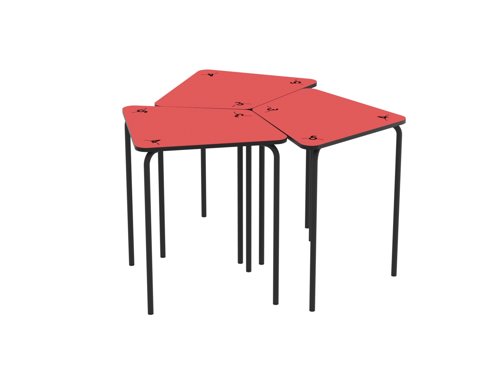 A PROGRAM 3.4.5. asztal legfőbb előnye a könnyű mozgathatóság, rakasolhatóság, amely mellett különös geometriája lehetővé teszi mind a 3, mind a 4, mind pedig az 5 asztal rés nélküli összeillesztését, a sarkok eszerint meg is vannak jelölve. A lábak 25 mm átmérőjű acél cső vázzal készülnek, szintezhető műanyag végzáró elemekkel alkalmazkodnak a talaj egyenetlenségeihez, melyek filc betétesek a burkolat kímélése érdekeben. A fémváz alján gumipufferek óvják az asztallapot az egymásra rakásolás esetén. A különböző uni színű 18 mm vastag laminált asztallapok egységesen 2 mm vastag fekete színű élzárást kapnak. Mivel a szerkezet metrikus csavarokkal van összeszerelve, igény szerint bármikor szét és összeszerelhető.
