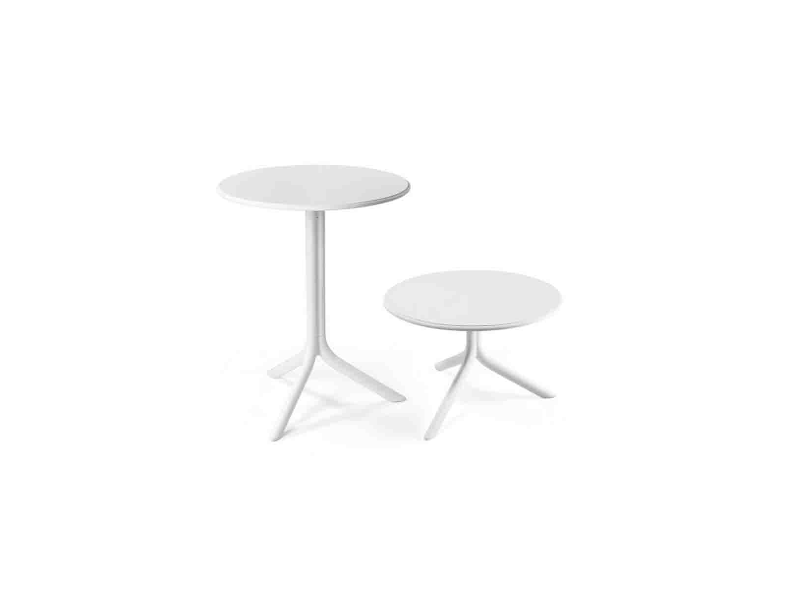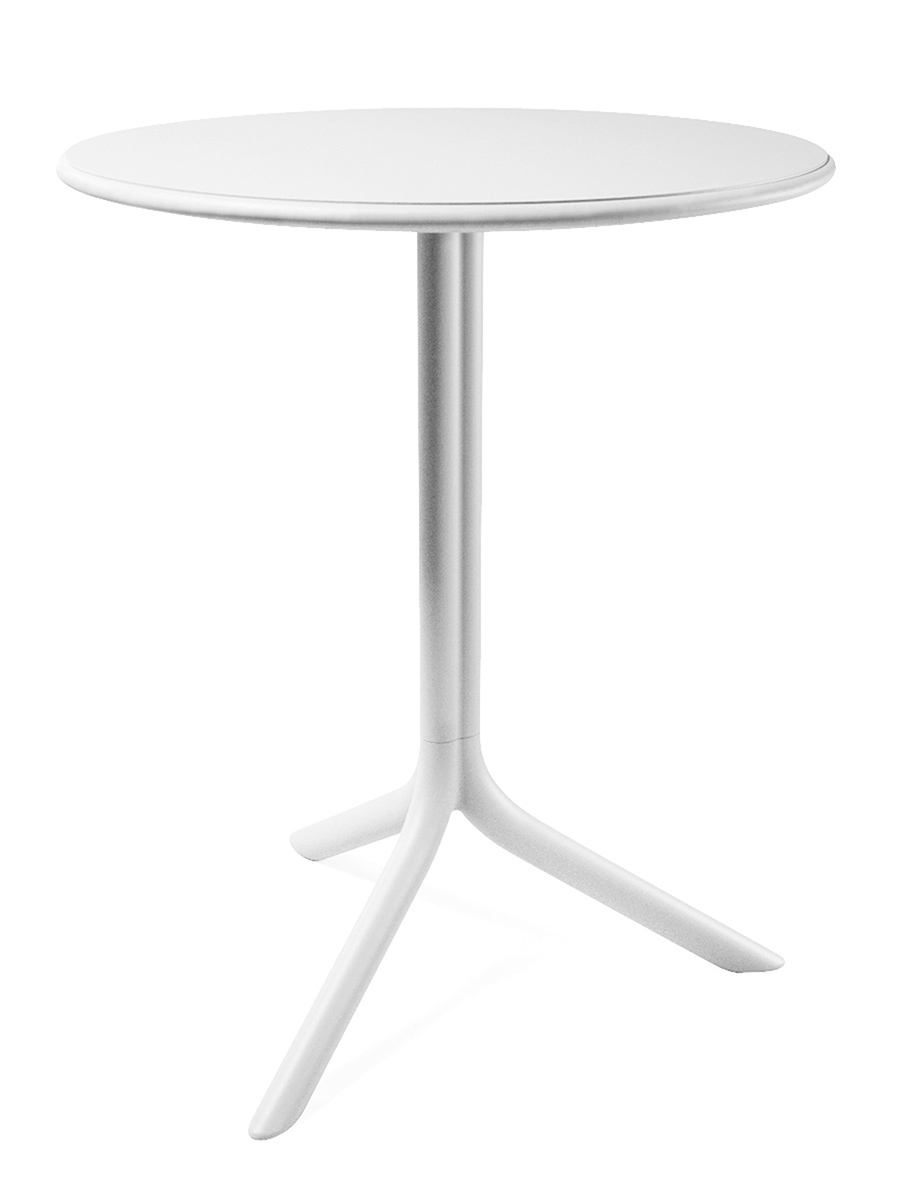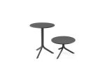 Központi oszlopos, üvegszállal erősített UV álló matt felületű műanyagvázas asztal és kisasztal, csúszásgátló lábvégekkel, minta nélküli műanyag asztallappal. Kültérre is ajánlott.