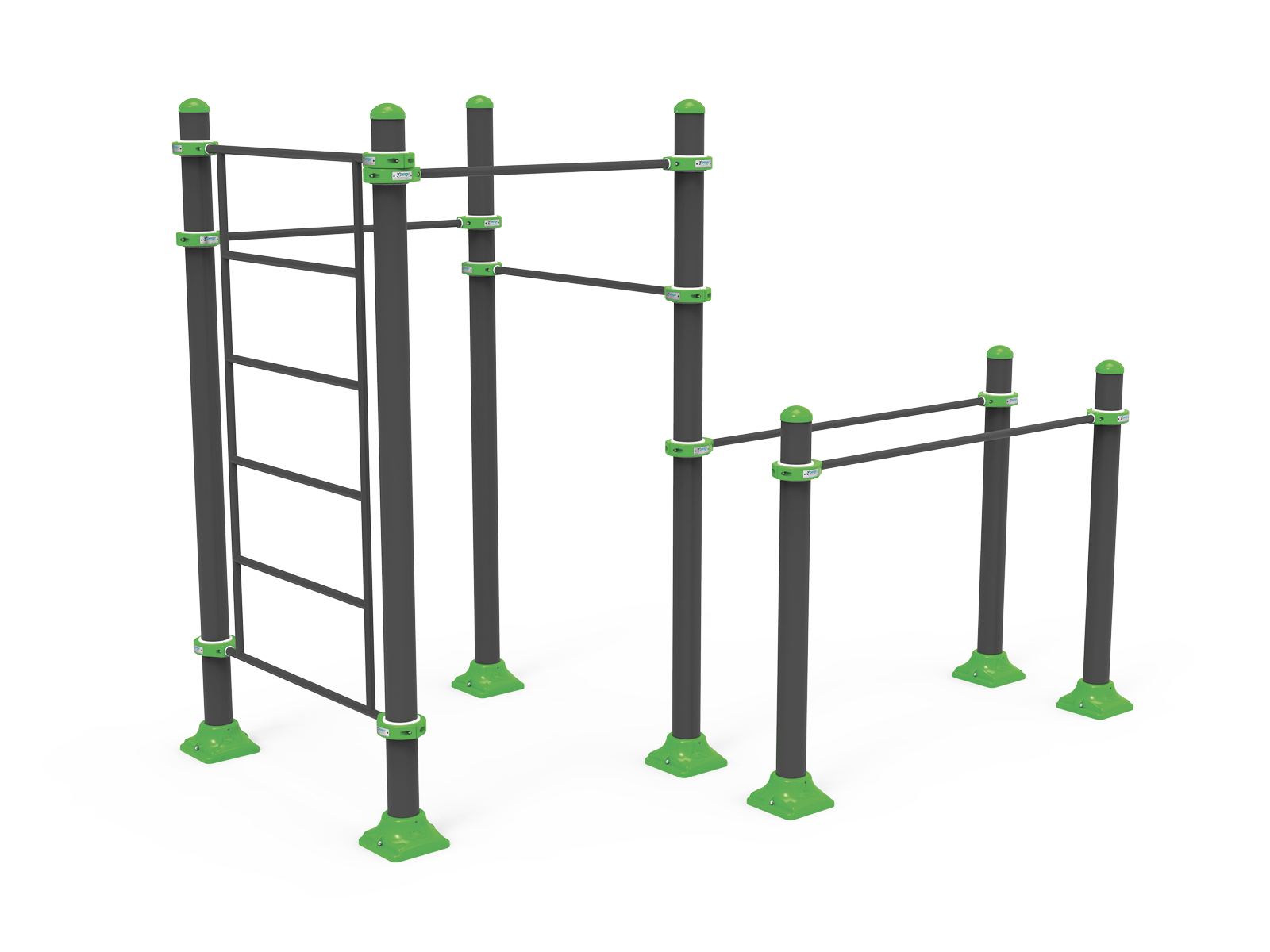 Az összeállítás kitölti az űrt a kültéri fitneszparkok és a játszóterek között. A szabványos kialakításnak köszönhetően igény szerinti, tetszőleges nagyságú szetteket lehet összeállítani. A szett 7 db függőleges, két különböző magasságú oszlopból, három rövidebb és két hosszabb keresztrúdból, valamint egy svéd falból áll. A szerkezet elemei bilincsekkel vannak egymáshoz rögzítve.