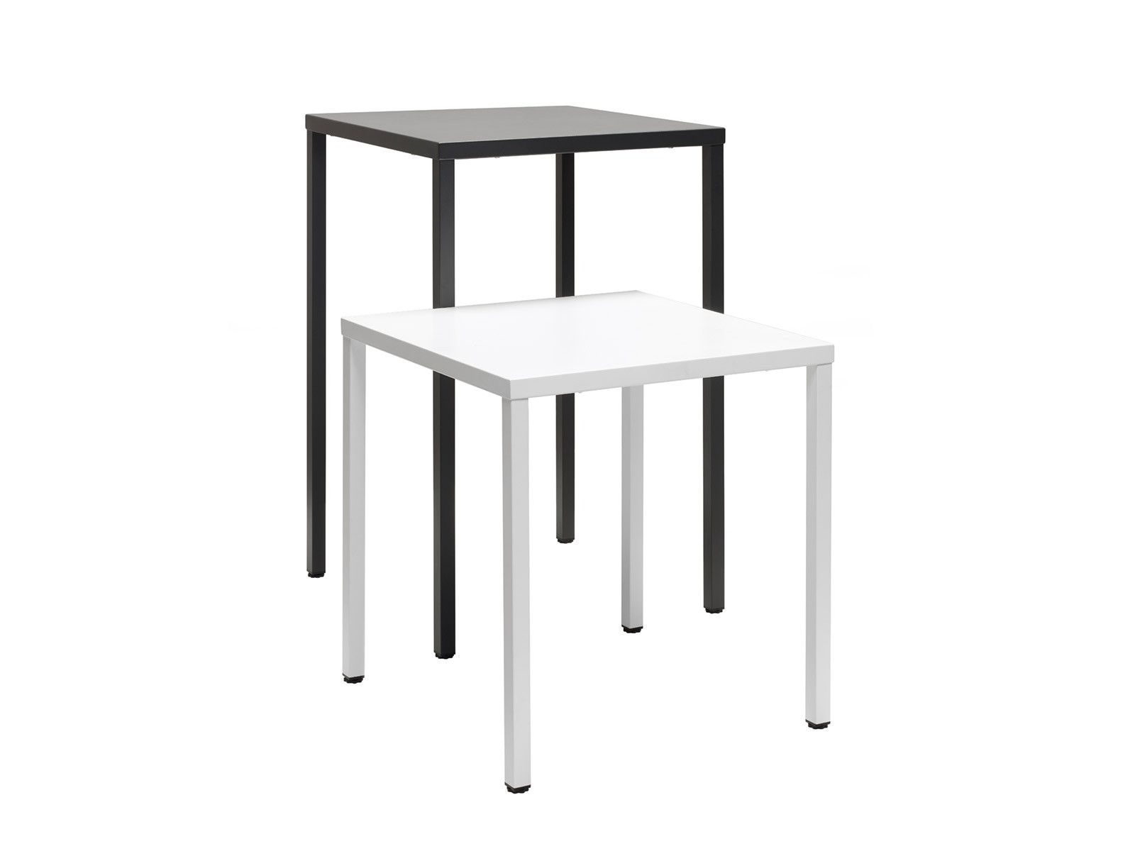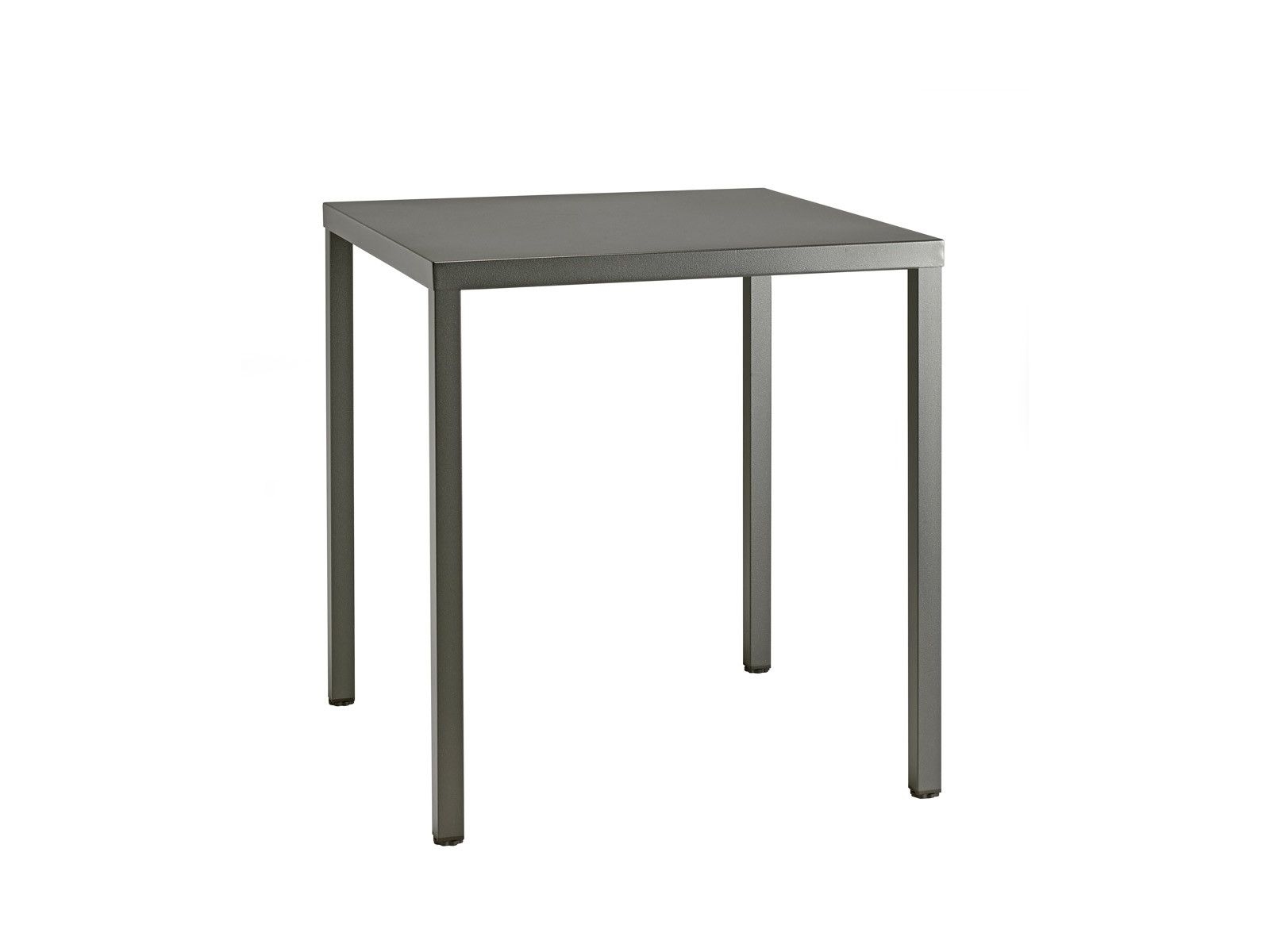 Horganyzott acél asztal, szintezős lábdugókkal, minta nélküli, 70×70-as asztallappal. Kültérre is ajánlott, rakásolható.