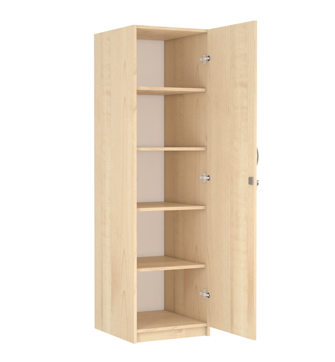 korpusz és ajtó: 18 mm vastag laminált bútorlap, 2 mm vastag ABS élzárás, hátfal: 3 mm vastag fehér színű HDF, 4 polcos, egy ajtós, biztonsági zárral szerelt kivitel.