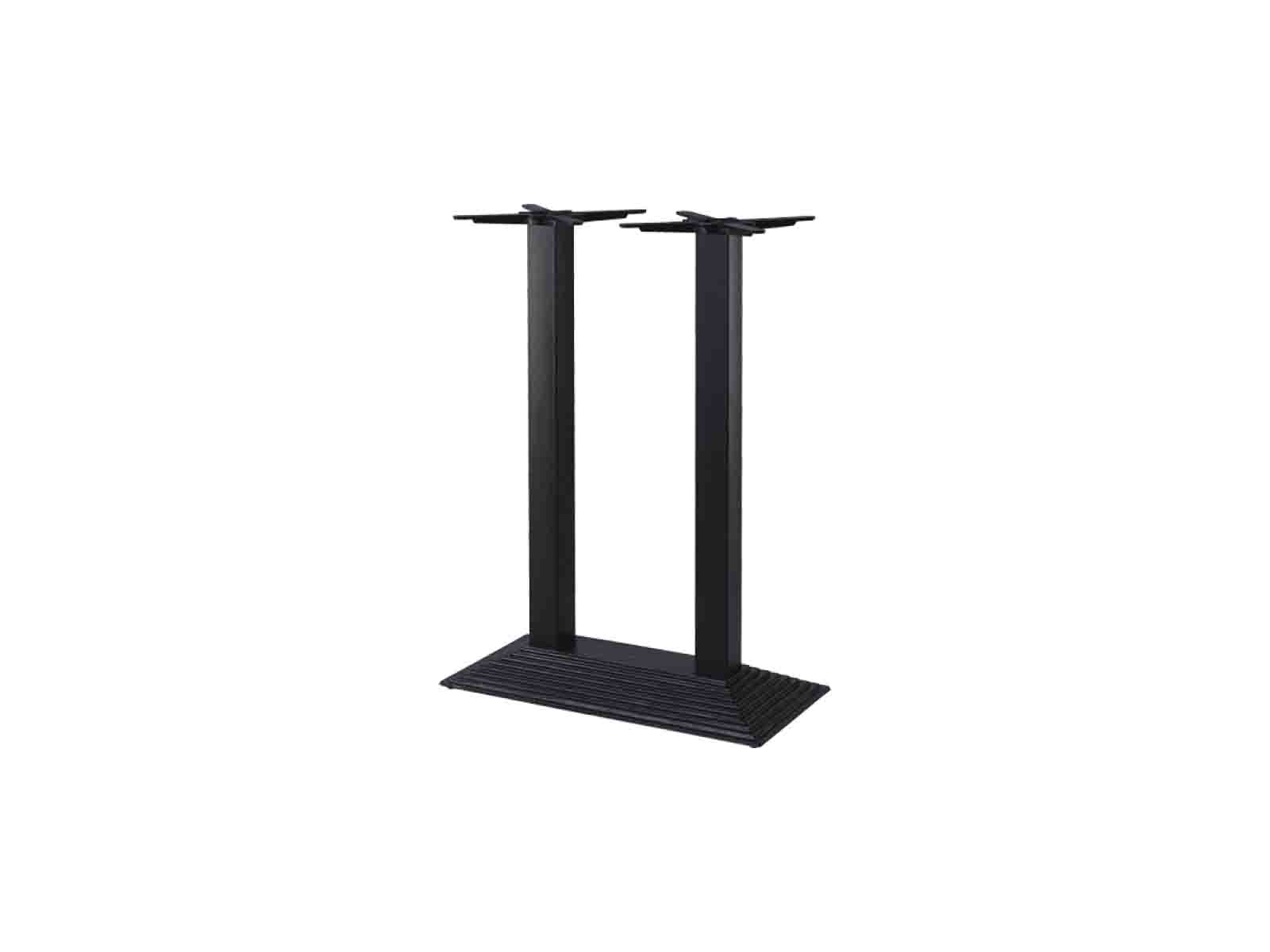 Fekete, öntöttvas, 43×80cm-es, szögletes, lépcsőzetesen kúpos talapzatú, dupla, szögletes oszlopos bárasztalbázis. Magassága 108cm. 110×60 / 110×70 / 110×80cm, stb. asztallapokhoz.