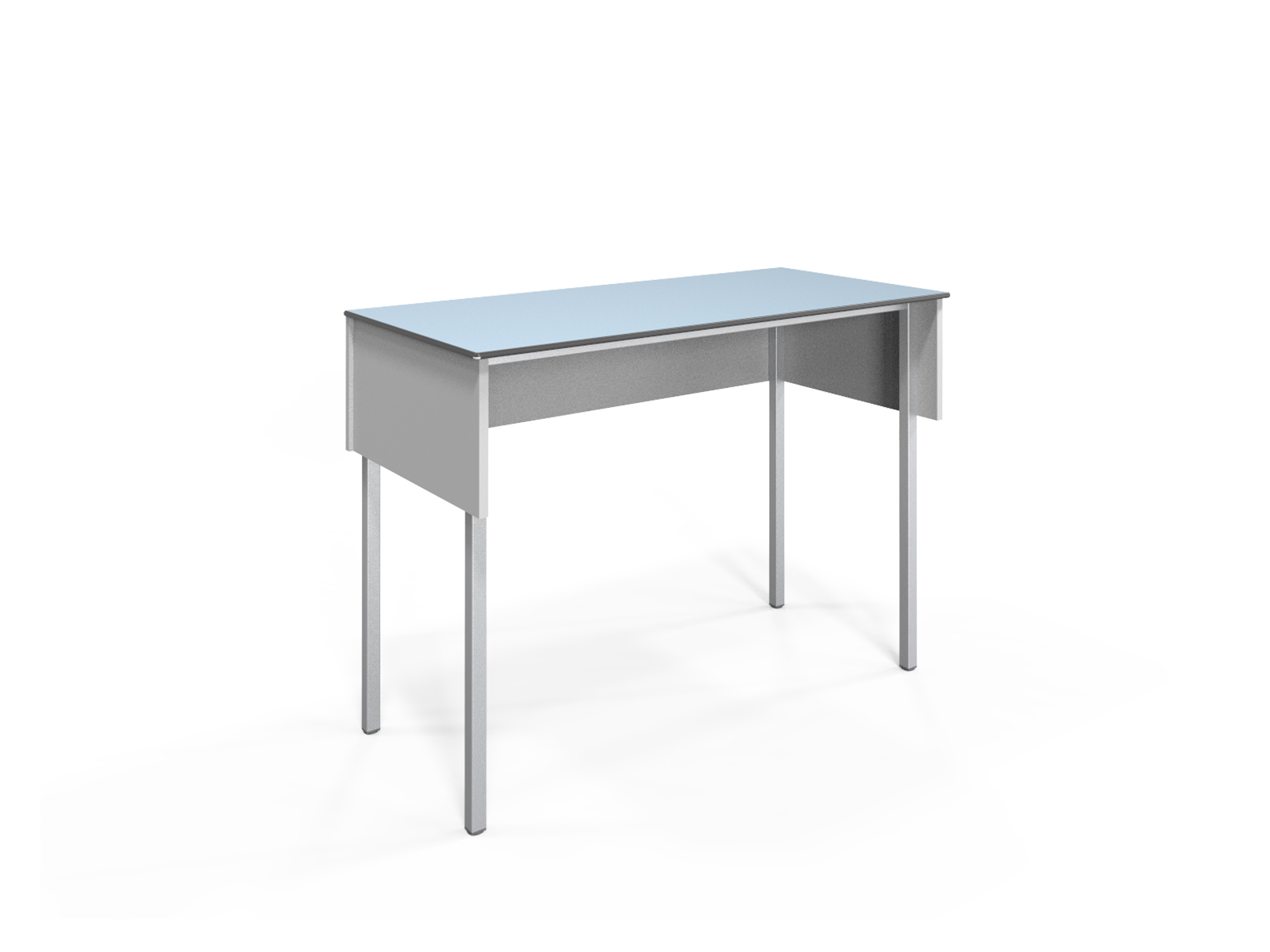 Vázszerkezet: 30*30 mm-es zártszelvény váz, szinterezett, műanyag padlóvédő elemmel, asztallap: 28 mm vastag fehér színű postformingolt HPL munkalap, homloklap és oldalak: 18 mm vastag laminált bútorlap, 2 mm vastag ABS élzárással. Álló magasságú.