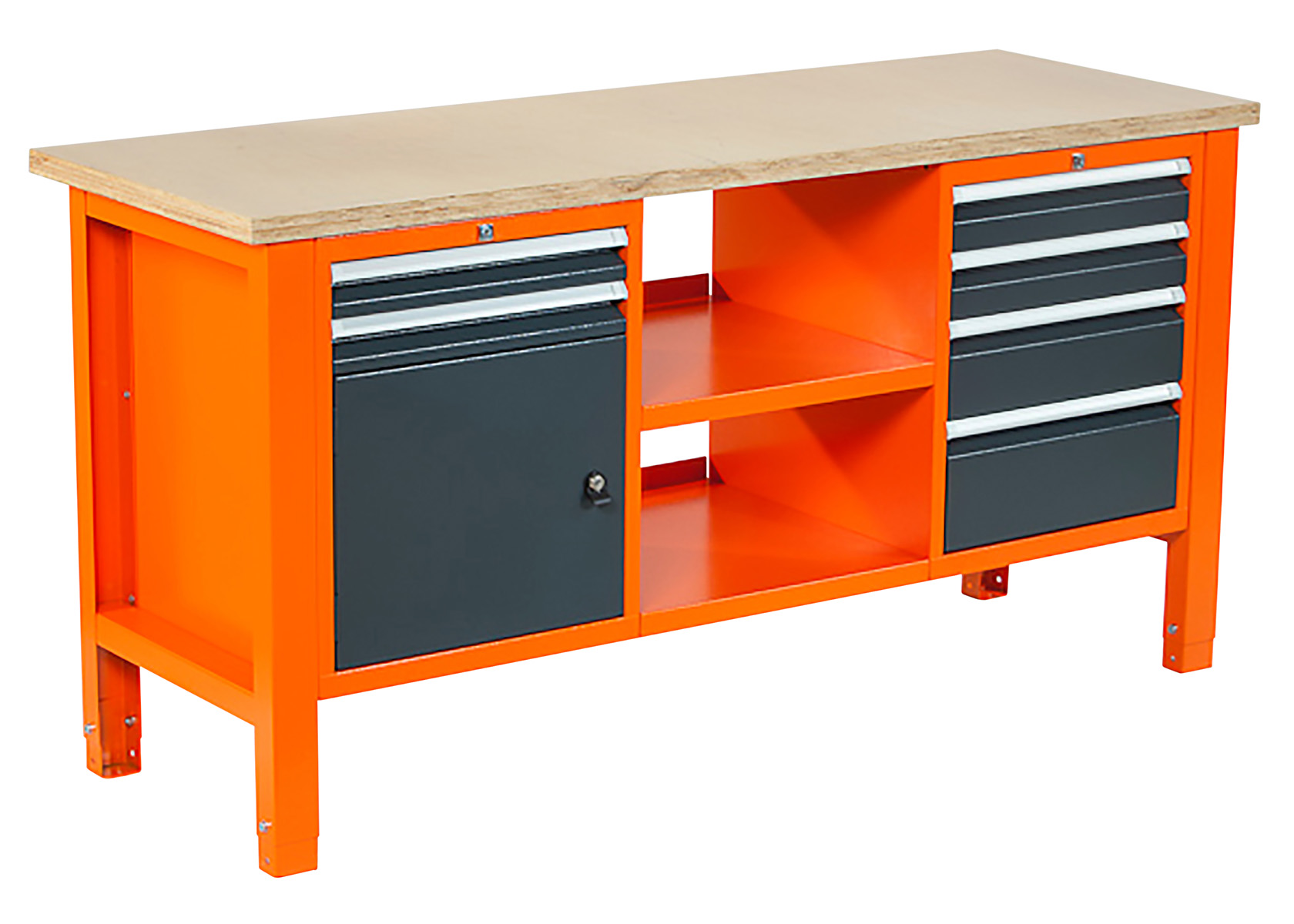 Strapabíró, funkciónális, a többi elemmel jól variálható munkapad, mely bármilyen munkafolyamatnak biztos alapja lehet. Az asztalok lapja 30 mm vastag rétegeltlemez, a váz elekrtosztatikus porszórással festett acél zártszelvény 1,5 mm-es falvastagsággal. Két magassággi méretre állítható, 85 cm vagy 90 cm-re. Teherbírása: 600 kg