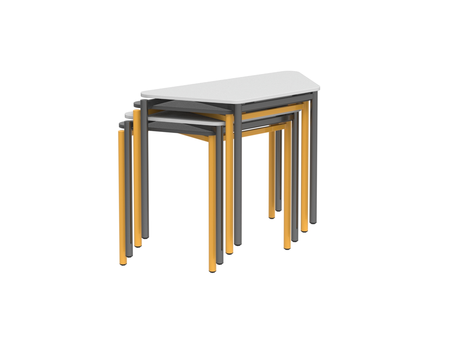 Vázszerkezet: 40 mm átmérőjű acél cső váz, asztallap alatt átkövővel a stabilítás érdekében. A lábak végén műanyag szintezőláb. Asztallap: 18 mm vastag laminált bútorlap, 2 mm vastag ABS élzárás, íves. 1 személyes, rakásolható kivitel.
