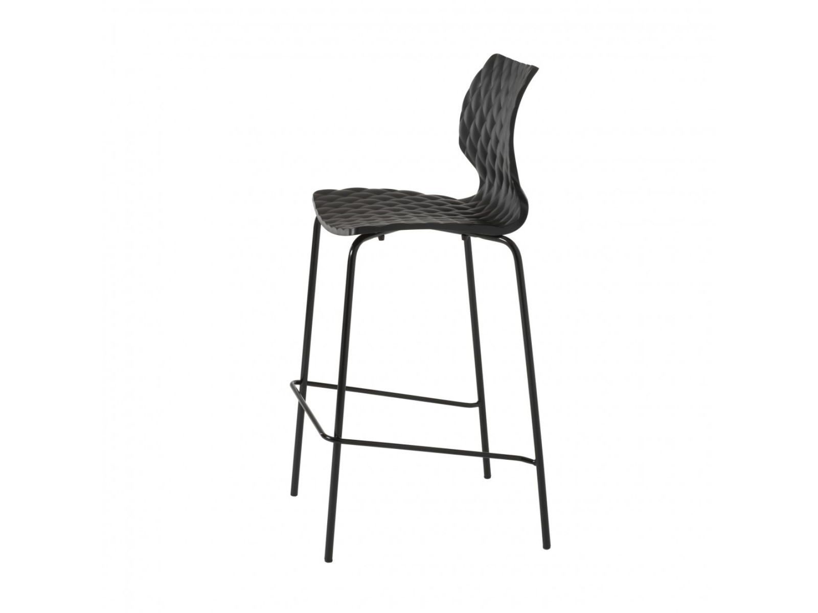 4 lábú, acélvázas bárszék, üvegszállal erősített, UV álló polipropilén palásttal, melynek mintázata a gyémántra emlékeztet. A láb kérhető krómozva, vagy szinterezve. Kültérre is ajánlott, rakásolható. Ülőmagassága 65 cm, de elérhető 76 cm-rel is (Uni 378). Színenként négyesével rendelhető.