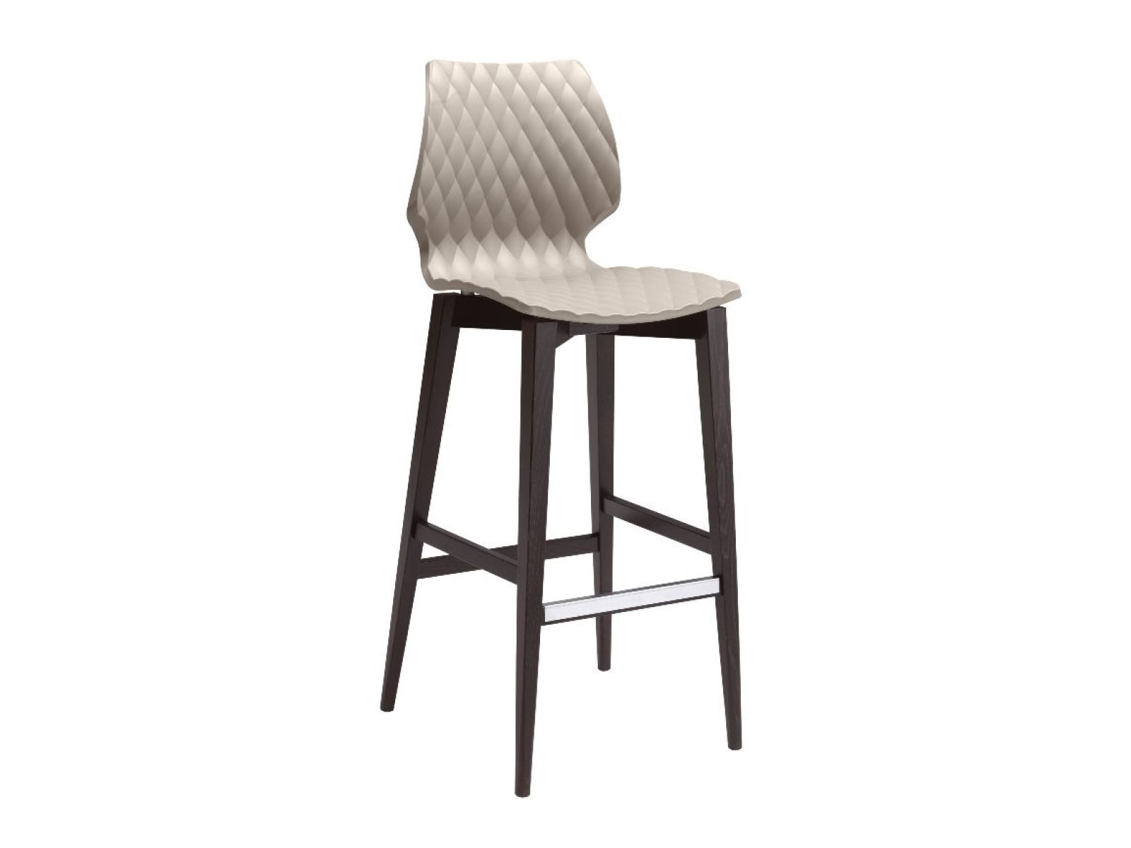 4 lábú, bükkfavázas bárszék, üvegszállal erősített, UV álló polipropilén palásttal, melynek mintázata a gyémántra emlékeztet. Ülőmagassága 77 cm. Színenként kettesével rendelhető.