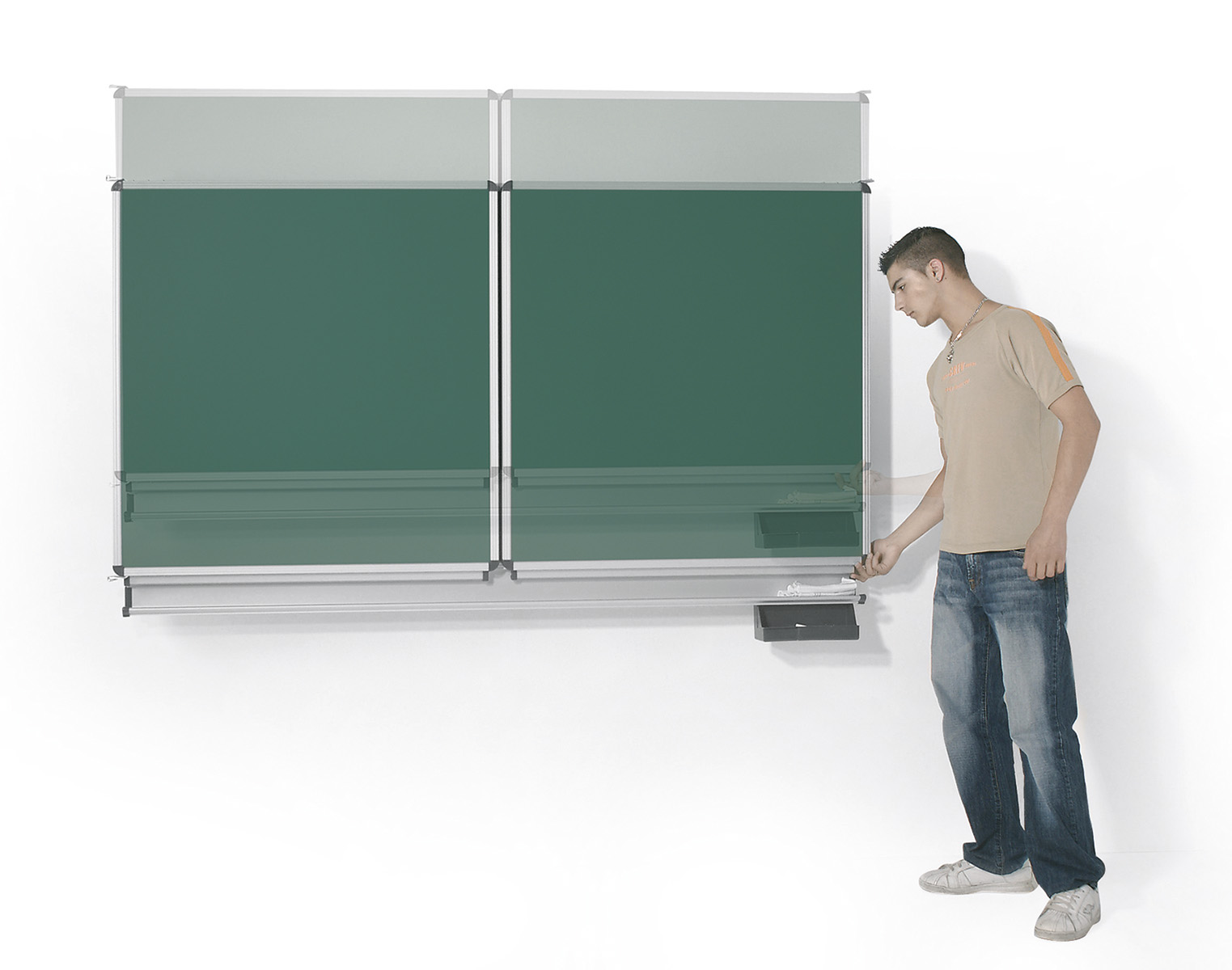 A falra szerelhető rugós táblamozgató mechanika segítségével magassága az ideális írásmagassághoz állítható 100 cm-es tartományban. Vario zománc-acél táblával.