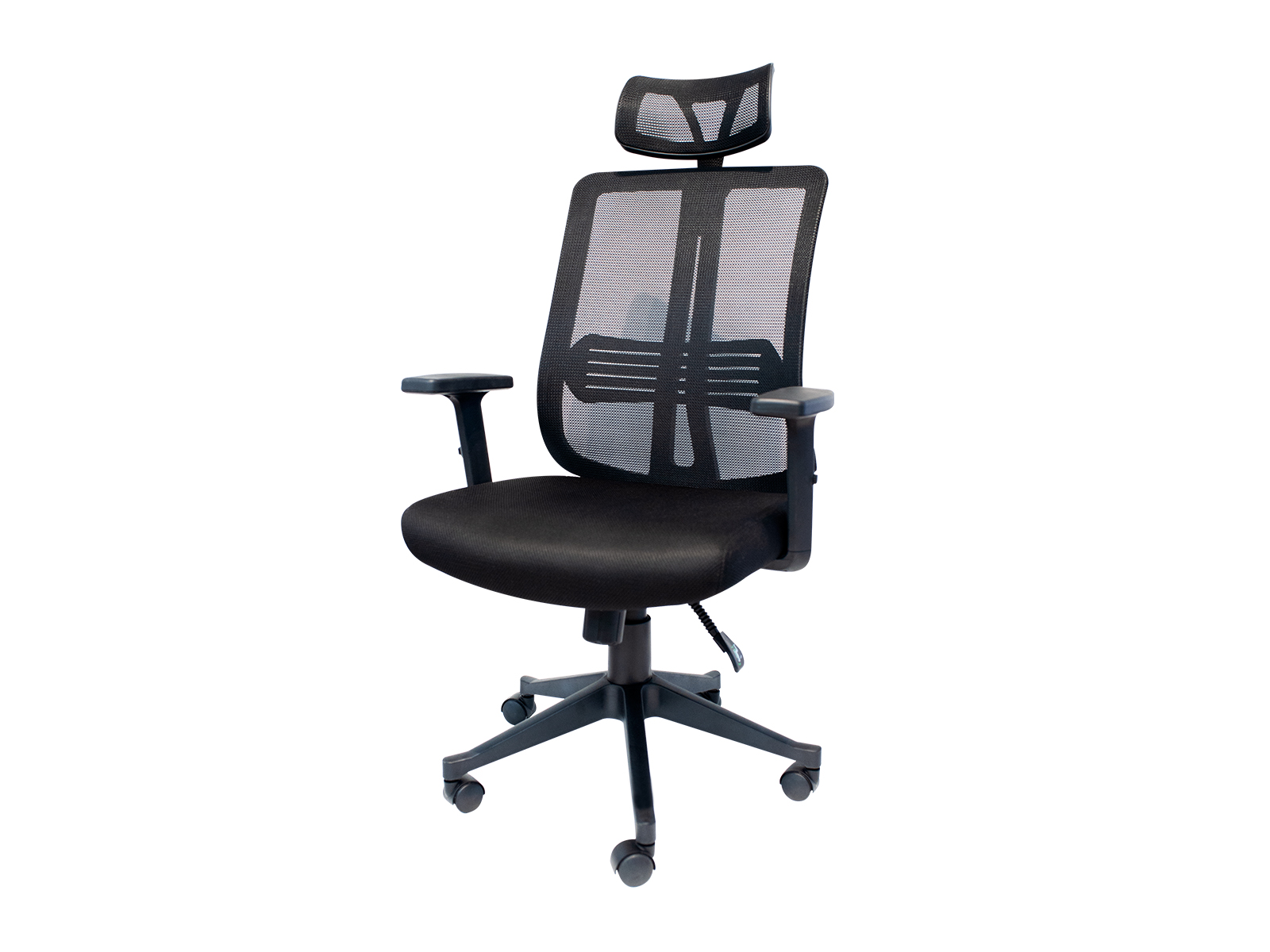 Magas háttámlás vezetői forgószék, hálós fekete háttámla, magaságban állítható fejtámla, fix deréktámasz, fekete mesh ülőlap, 2D állítható műanyag karfa puha könyöklővel, egyéni testsúlyhoz állítható Szinkron mechanika, ergonomikus kialakítása magasságban gázlift segítségével fokozatmentesen állítható ülőlap, fekete műanyag lábkereszt, teherbírás: 120 kg, napi használati idő: 3-5 óra