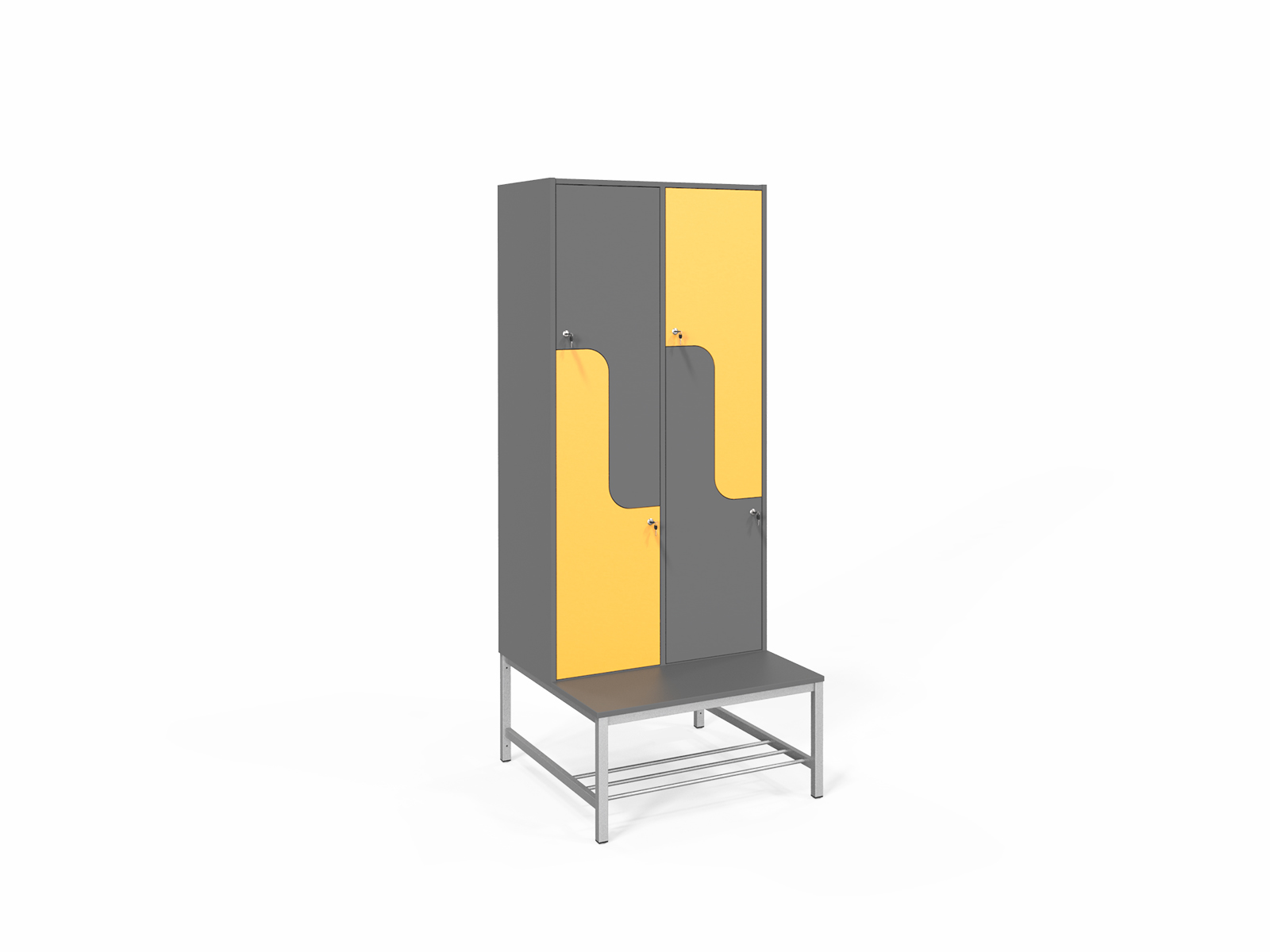 A korpusz, az ülőfelület és az ajtók 18 mm-es laminált bútorlapból készülnek ABS élzárással. A hátfal HDF lemezből van. A lábak elektrosztatikus porszórással felületkezelt 30×30 mm-es zártszelvényből készünek, a cipőtartó rács 13 mm-es acélcső pálcákból áll. A lábak végén szintezhető dugó van.Alapfelszereltség: ruhaakasztó rúd, ruhakampóval, kétkulcsos biztonsági zár, hátoldali szellőztető. Az új kialakításnak köszönhetően a szekrény teljes magassága rendelkezésre áll a pakoláshoz.