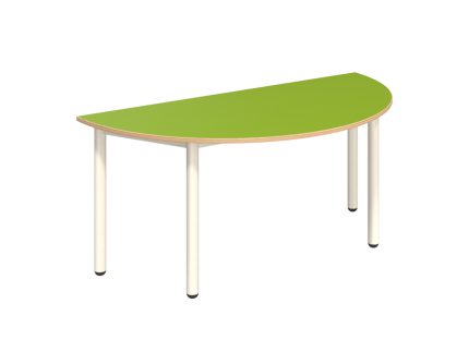 Mese félkör asztal fém vázzal, rétegeltlemez, dekorit borítású asztallappal