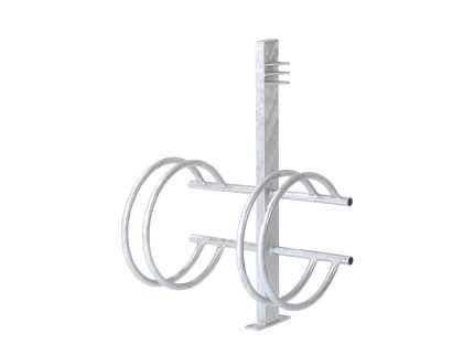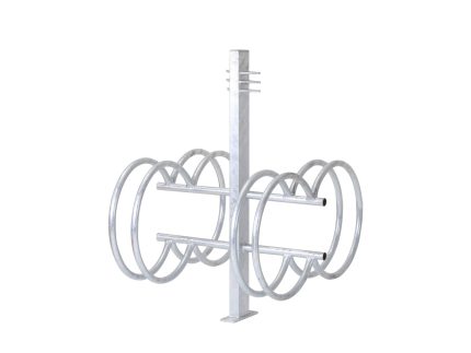 Formabontó megjelenésű kerékpárállványok, melyekhez egyszerre két kerékpár támasztható és lakatolható két oldalról. Hajlított csőből és lézervágott elemekből készült, horganyzott, igény szerinti színre porfestett kivitelben. Lebetonozható vagy dűbelezhető rögzítési móddal.